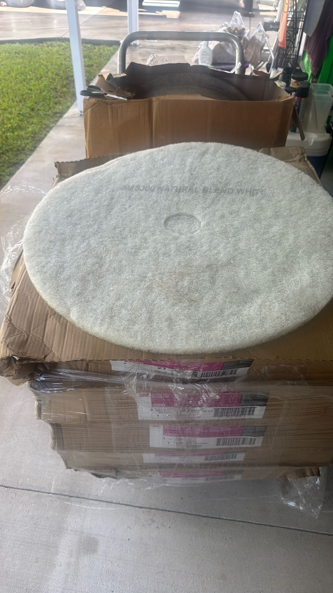 5- Boxes 3M 27in Natural White Burnishing Pads. Each boxes contains 5 Pads . 1 Box ACS 27in Burnishing Pads Jaguar . Box contains 11 pads . Selling all together. If it doesn’t say sold it’s available