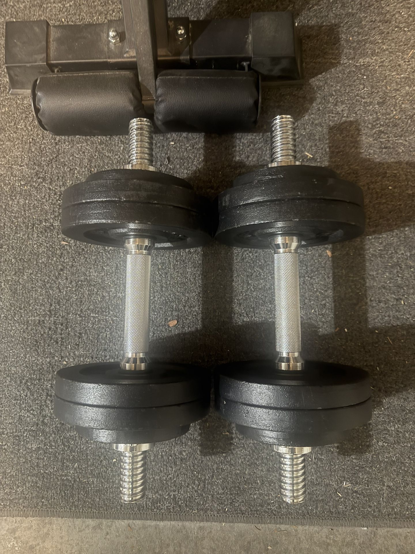 Each Dumbell can hold up to 52.5 pounds of weight. Set comes with all weight plates, getting rid of because I have no use for them. Only about a year old. A set goes for $170 on Amazon.