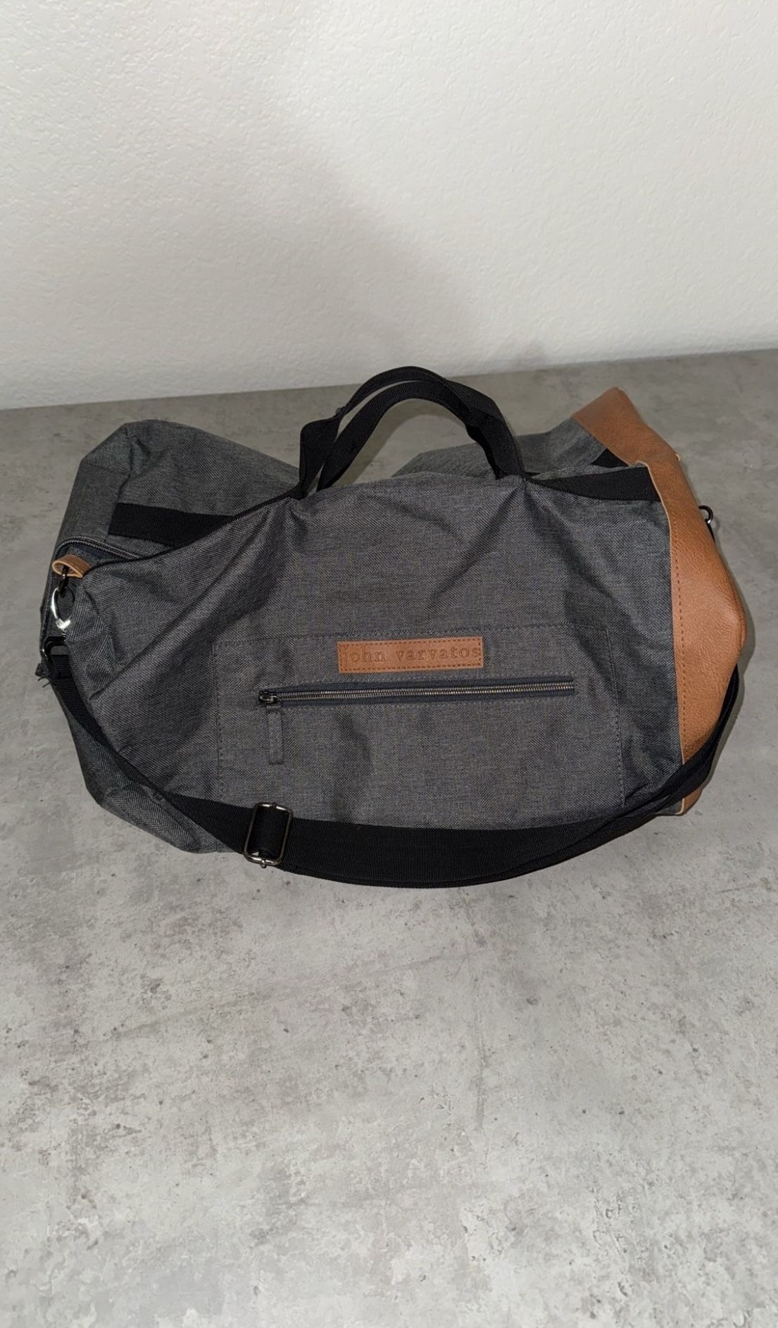 John Varvatos duffel bag in like new condition, used only a few times. The interior and exterior are very clean with no marks, stains, or damage. Features genuine leather trim, an adjustable shoulder strap, and sturdy handles for versatile carrying. Stylish and high quality, perfect for travel, gym, work, or everyday use. Selling because it is not being used.
