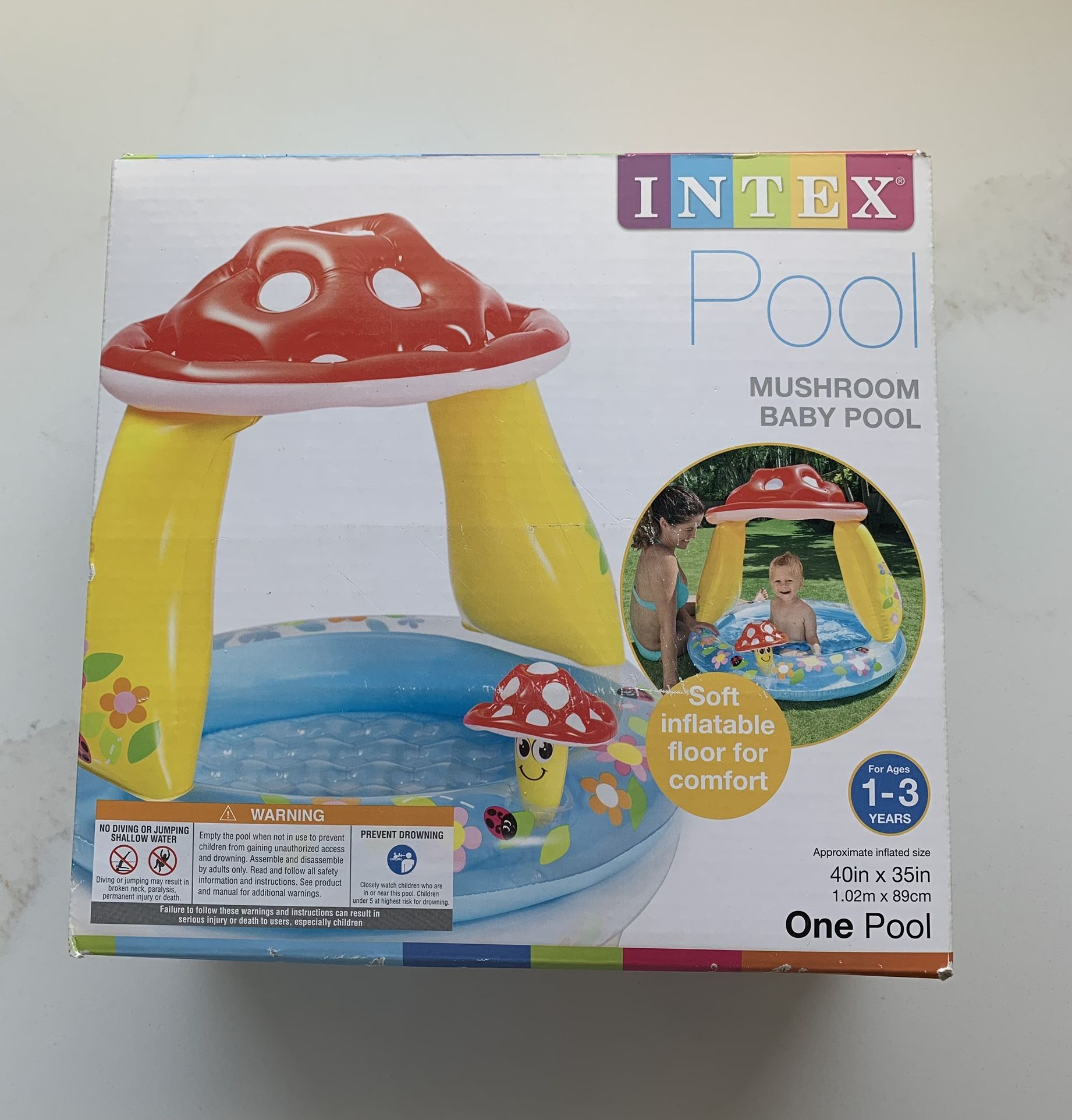 Intex Inflatable Mushroom Water Play Kid Baby Pool. Ages 1-3. With built in Sunshade Canopy Inflatable Dimensions: 35” x 40” Water capacity - holds up to 12 gallons Includes repair patch