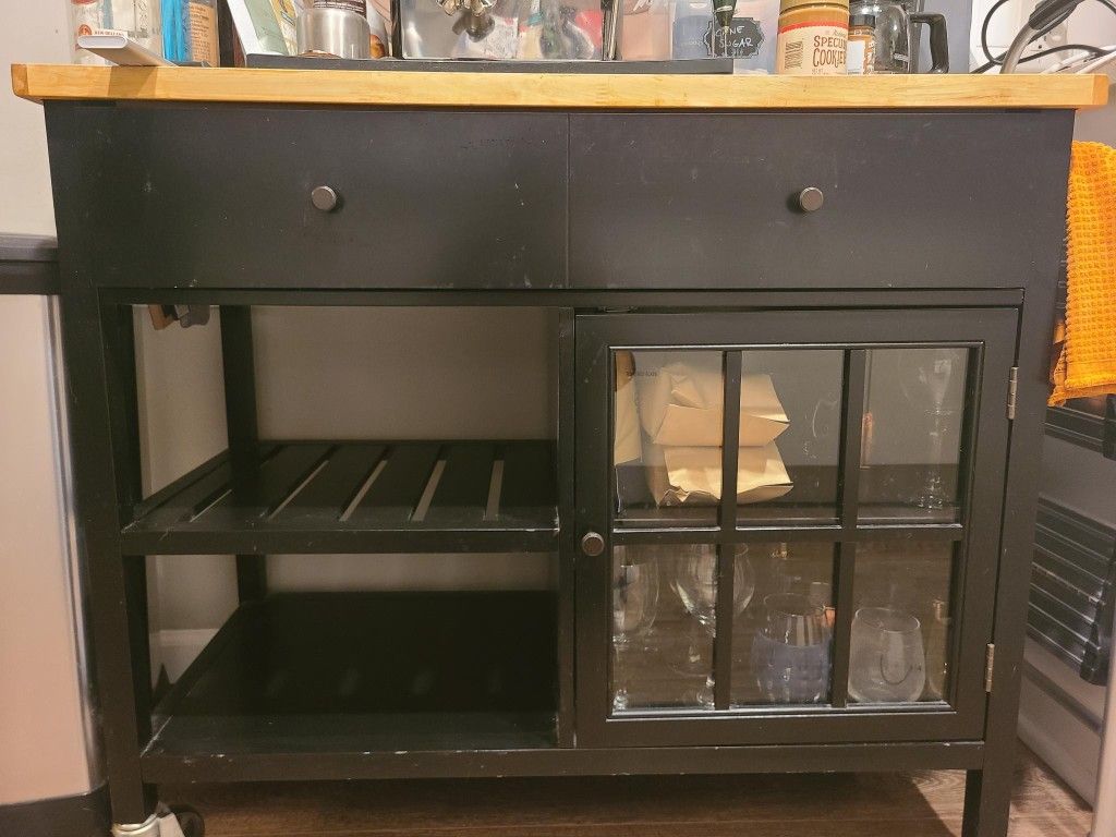 Great condition. 40" wide x 19" deep x 34" high Large top drawer, shelves and cabinet. Wheels on two legs for easy adjustment. Black body with lighter wooden top. Wine glasses in the cabinet can come with it if you'd like. Pickup only in Van Nuys