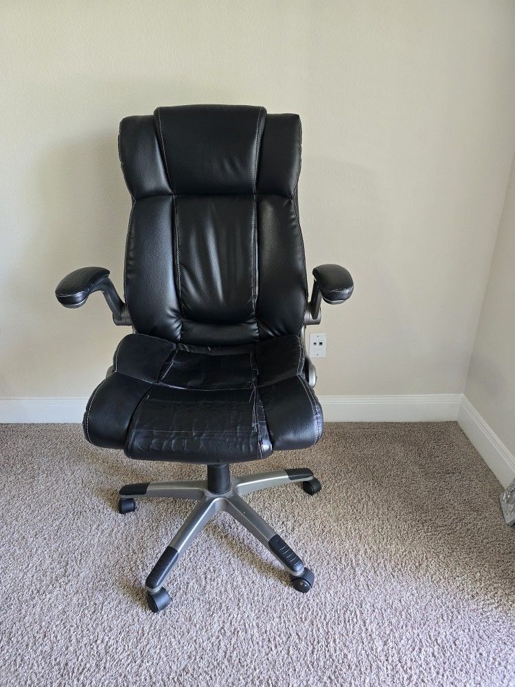 Comfortable black leather executive office chair in good condition. Features padded seat and back, cushioned armrests, adjustable height, and smooth-rolling wheels. Sturdy base and great support for working from home or office use. Normal wear from use (see photos), but fully functional and still very comfortable. Great for home office, student desk, or workspace setup. Pick up location near Westheimer Road & Eldridge Pkwy, Houston, TX 77077.