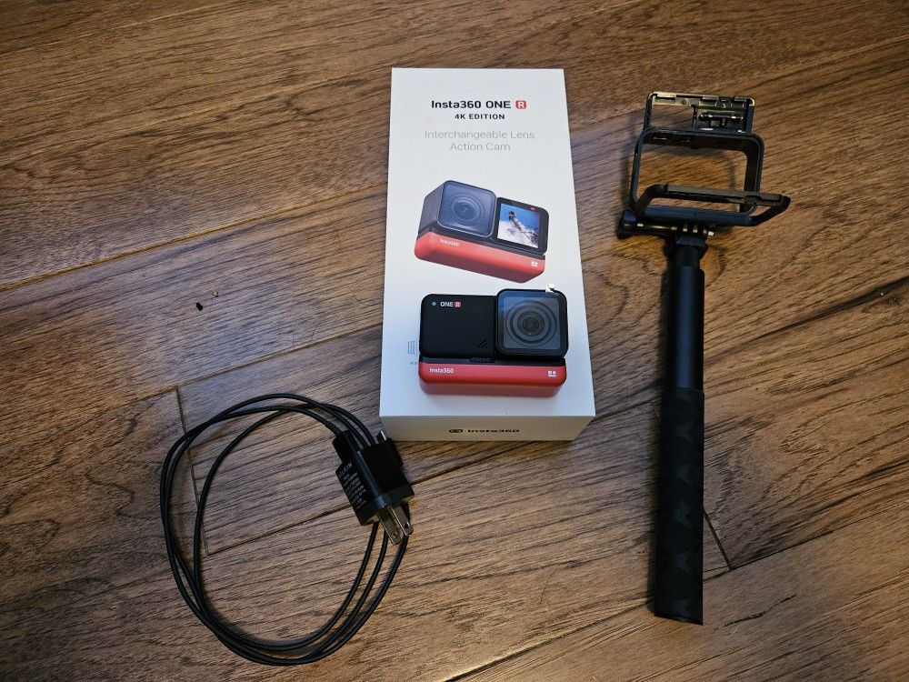 Insta360 One R 4K Edition Interchangeable lens action cam -Core, 4k wide angle mod, battery base, mounting bracket, charging cable -invisible selfie stick -32gb SD card -original box included Almost new condition still has protective plastic on lens and screen!