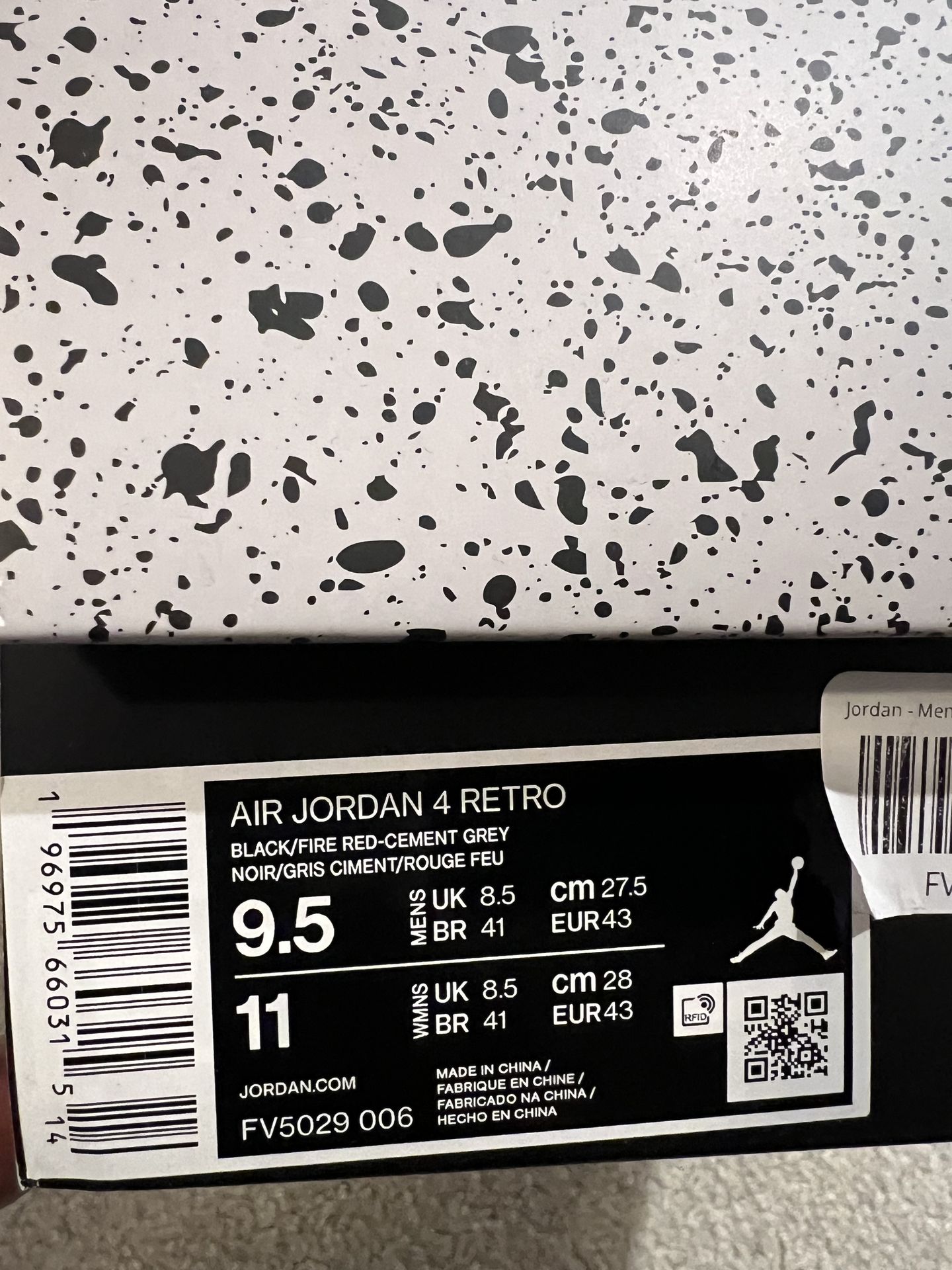 AIR JORDAN 4 RETRO BLACK/FIRE RED-CEMENT GREY NOIR/GRIS CIMENT/ROUGE FEU 9.5