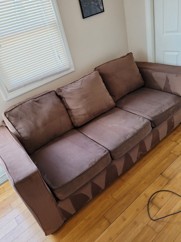 7 ft long x about 38 inches wide. Used, but in GREAT shape. There's a dog in the house, but he's not kept in the same area as the couch. Cushion covers are removable for washing. Comes with an ottoman and a long cushion, to convert any one of the three seat cushions to a chaise. We also have 2 throw pillows in the same fabric. Cross posted. Pick up in Red Bank, by the train station.