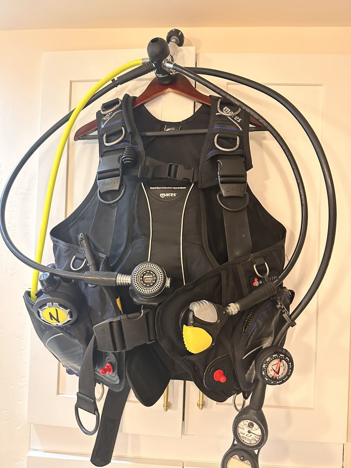 Selling my Mares bcd size Large including mares regulator. Its in pretty good shape. Regulator needs to be serviced, equipment was sitting for 1.5 years on my closet. Regulator has to be serviced once a year.