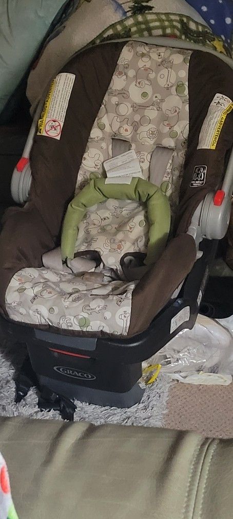 Unisex car seat Graco with elephants and gray and brown and in great shape includes a baby neck support that you can take in or out that matches. In good condition and has a snap-in base