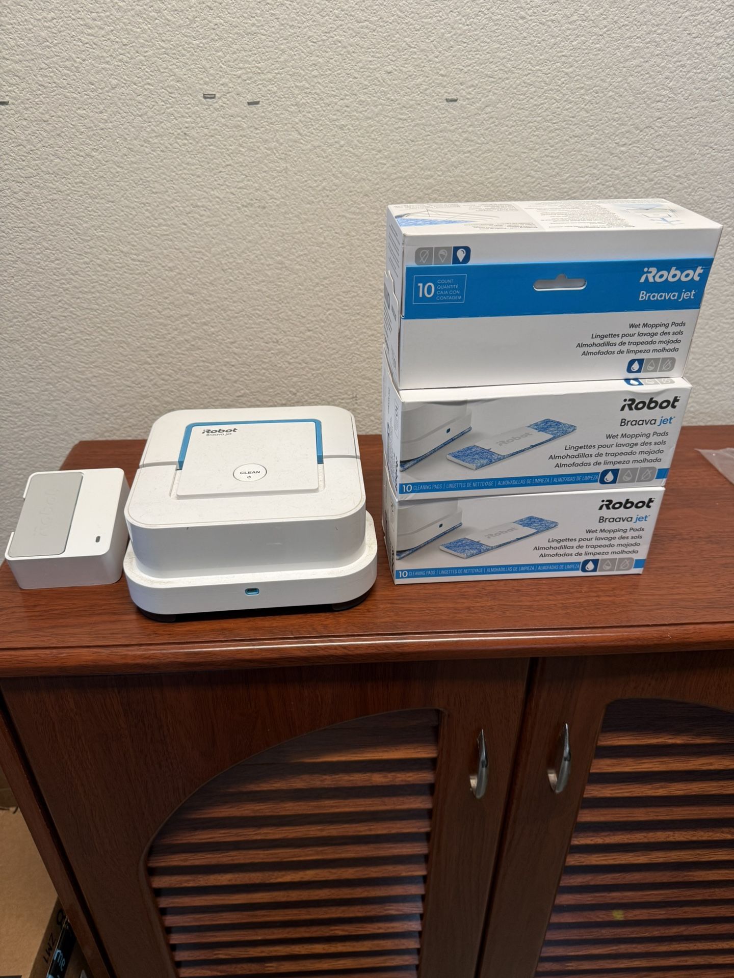 iRobot Braava jet with 3 new boxes of mopping pads. The units works well but may need a new battery ($20 on Amazon) for optimal performance