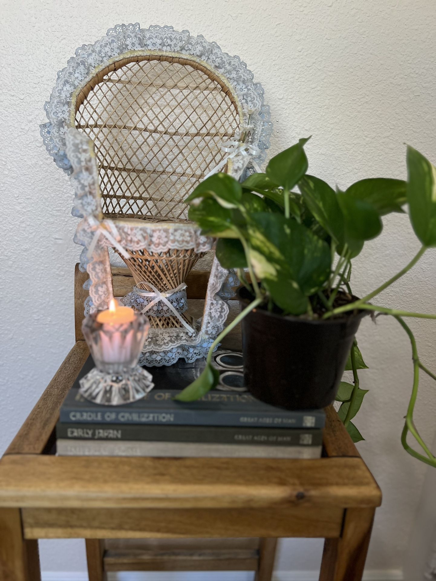 Cute mini rattan chair. Lace can be changed/removed. Great for a plant, doll, stuffed animal, candle, children’s room, bookshelf, etc. 🌹boho, bohemian, American Girl doll aesthetic, timeless, classic EASY PORCH PICK UP CASH OR VENMO ACCEPTED