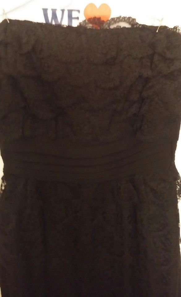 Make an entrance at the New Year Eves partying this eye-catching vintage dress. Can be worn strapless or use the chiffon straps for a more dramatic look. The dress has a back zipper and is fully lined. It also has a slit in the back for easy walking. The waist has a chiffon cumberbun effect. The entire dress is scalloped lace. It is in perfect condition. There is no size label. Measured flat. Waist approximately 12". Hips approximately 18". Total length from the top of the bodice to the bottom hem is 39". Guess that this is a size 8 or 10. Dry cleaned.
