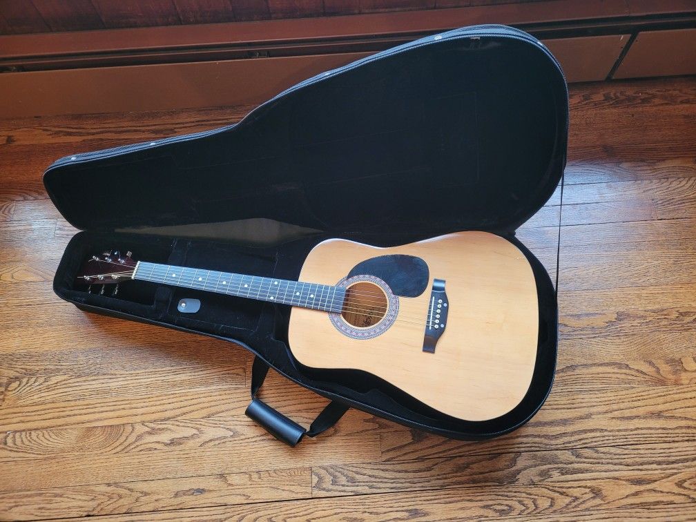Great beginner guitar in excellent condition. Plays great, new strings. Comes with case and strap.