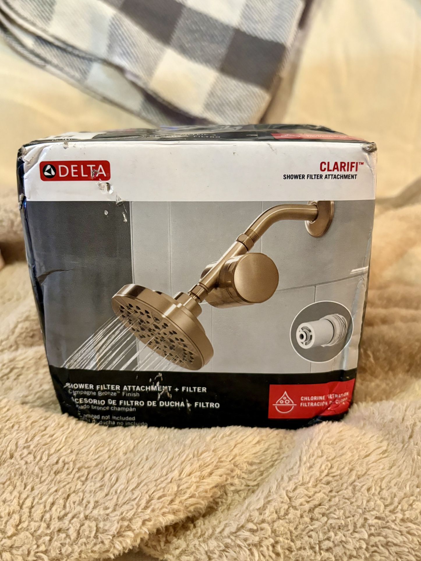 Brand new Delta Clarifì shower filter attachment in champagne bronze. Box has some wear but the filter and parts inside are unused. Helps reduce chlorine and impurities for softer skin & hair. Easy install and fits most showers.