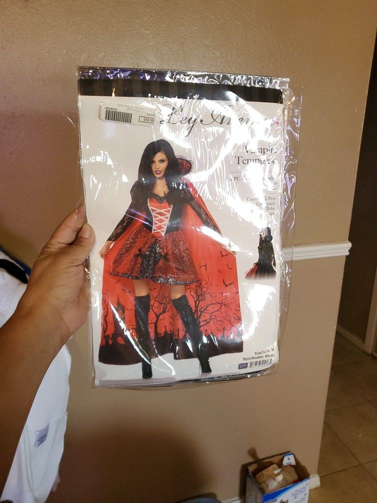 Lady Vampire costume with cape, necklace, long socks, press on nails, & 2 sets of fangs. Paid $60 for costume with cape and $25 for accessories Asking $40 for all