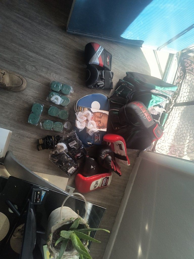 Well I don't have headgear and I don't have cups but I have in the bag like seven or eight mouthpieces jump rope speed mitts hand wraps several I think like four or five hand wraps brand new and I think there's at least one new brand new pair of two brand new two brand new paragloves in there and then some other gloves and then there's a mouthpieces and a Mike Tyson book and something else but anyways all right