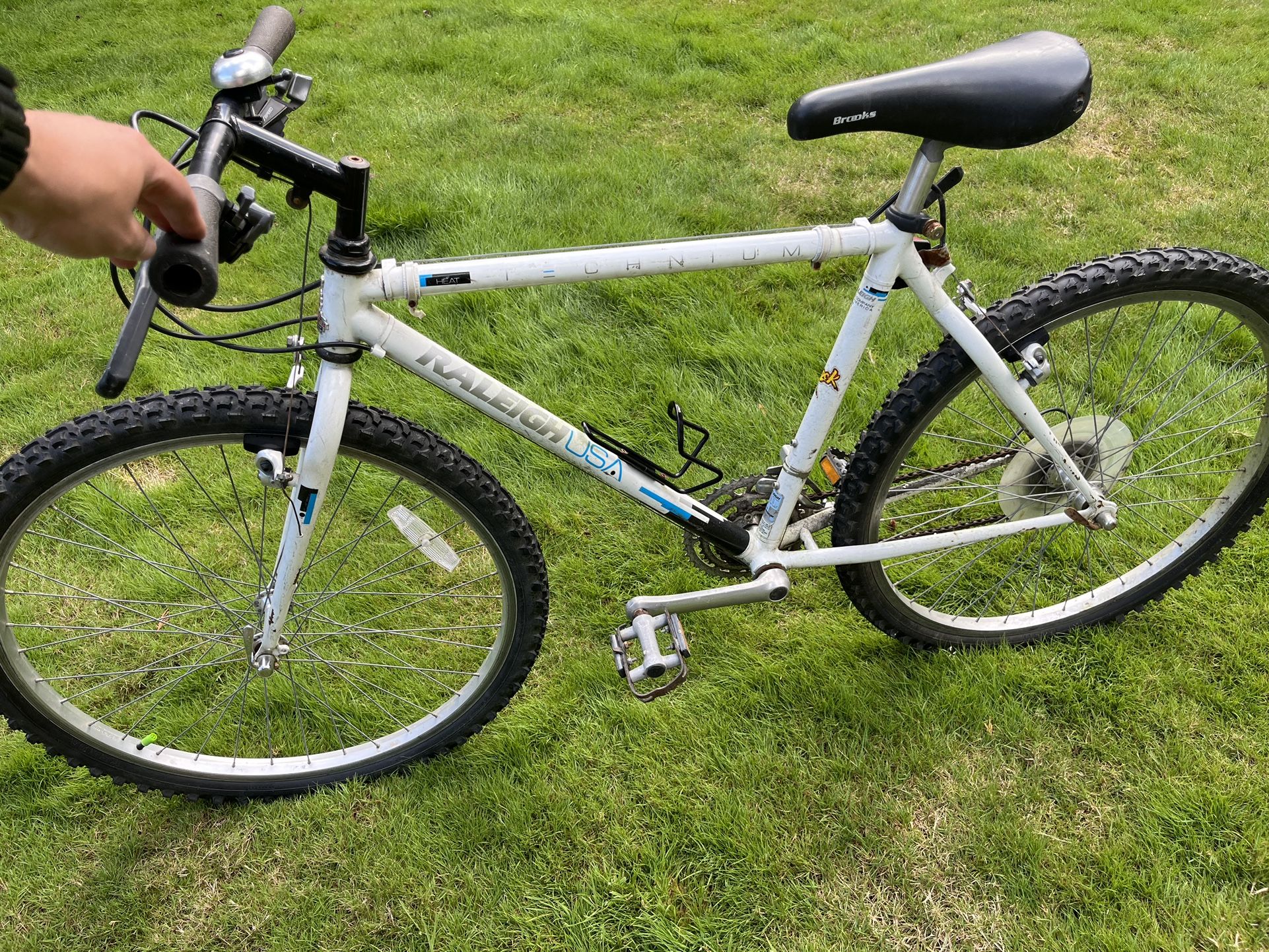 This bike is a nostalgic classic mountain bike. It’s a Raleigh USA Technium heat, and it’s super light weight. It’s needs some TLC flat tires, lubed chain, that type of stuff, hence the low asking price.