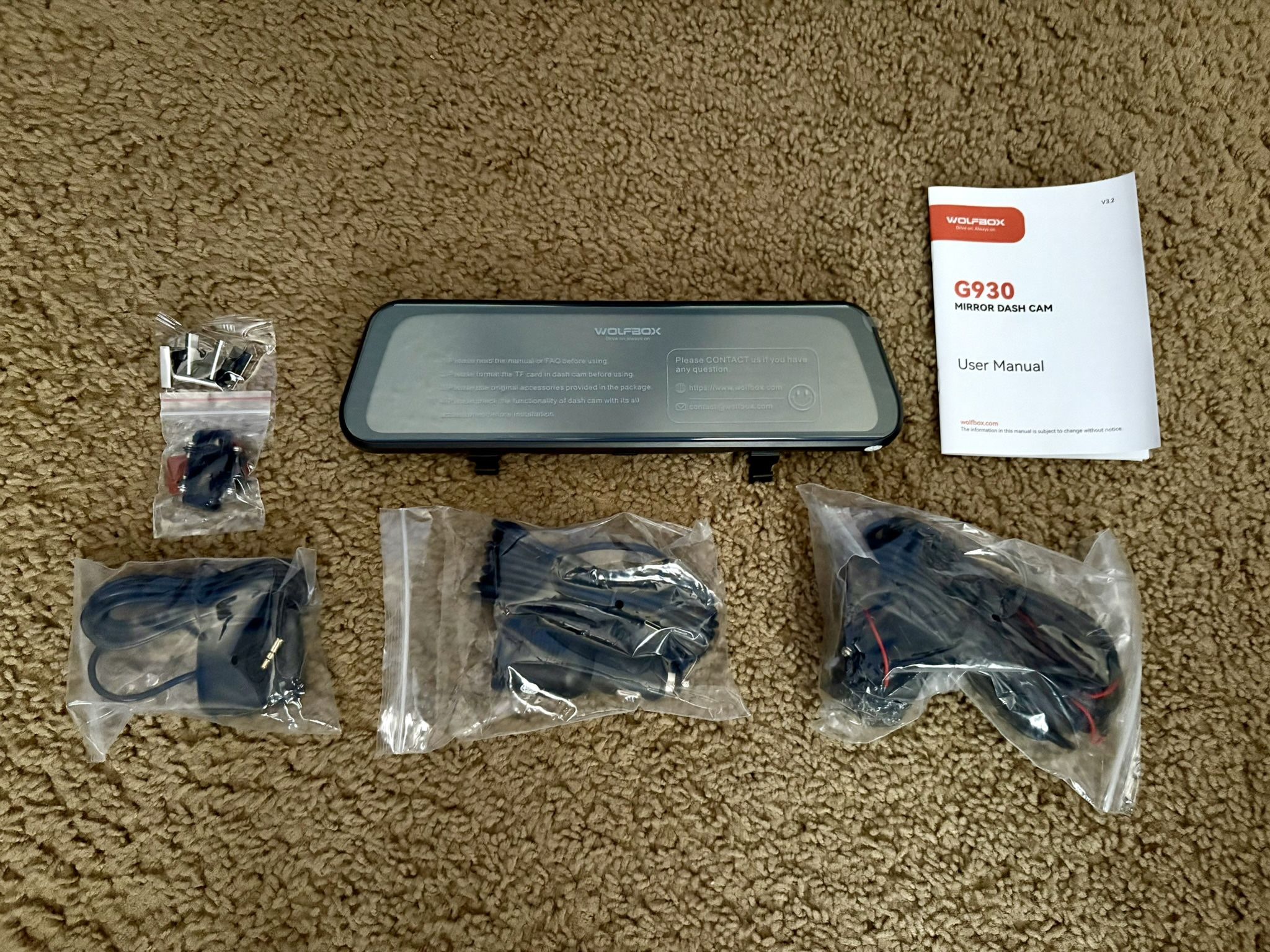 Brand new. Wolfbox mirror dash camera 4k. Includes rear reverse camera, GPS antenna and SD card. Pick up in suwanee.