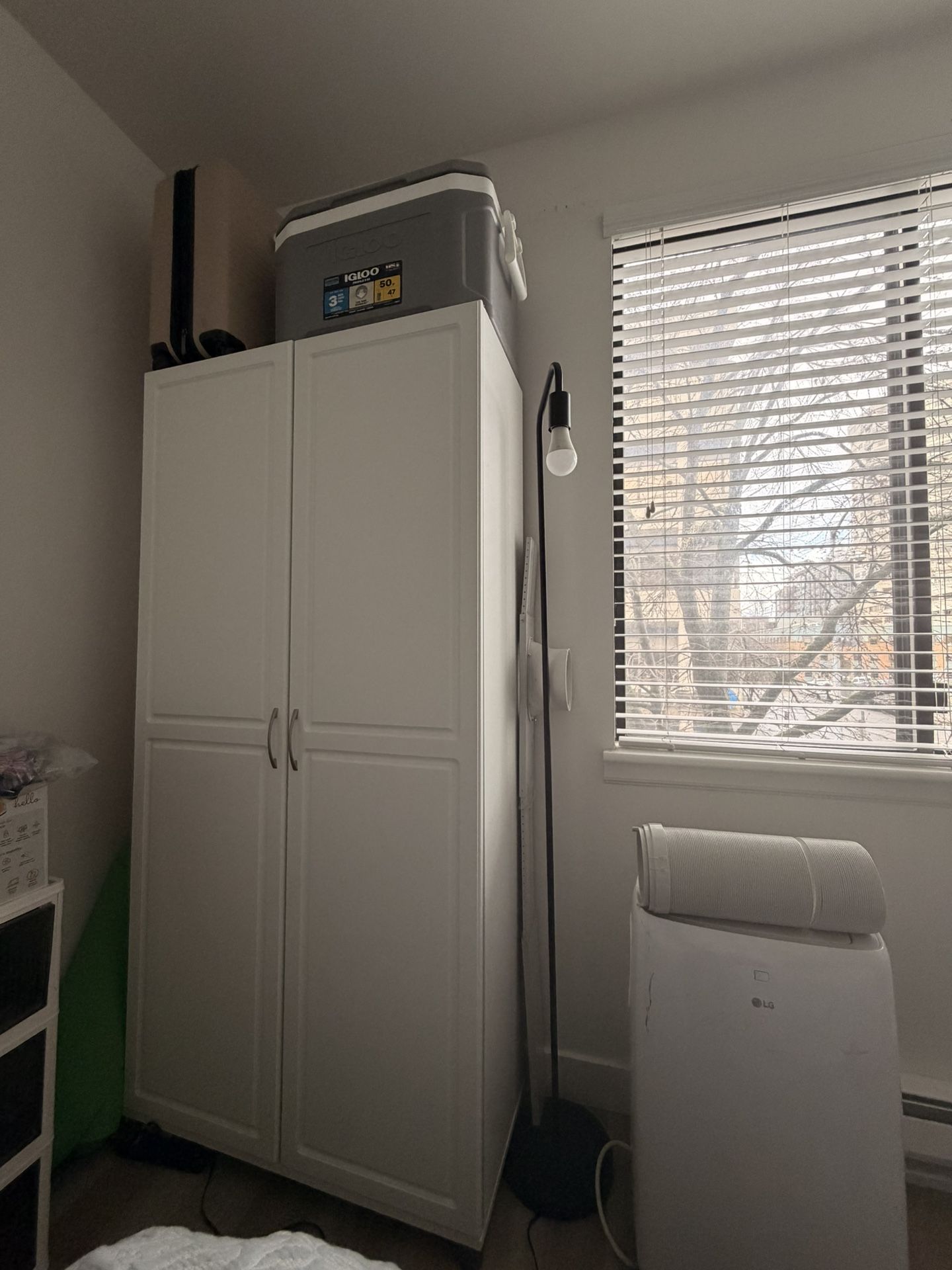 White storage cabinet, I used it as an external clothing cabinet, but it can be used as pantry as well 5 tiers of shelves inside Specs: L 36 in, W is 15.5 in, 71 inches H