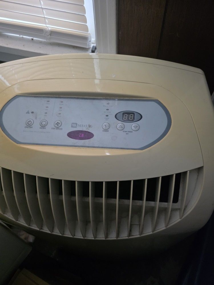 Portable standing air conditioner w/wheels Window attachment included Too big for area we placed it in; Works good, good condition, blows cool air in any size room.