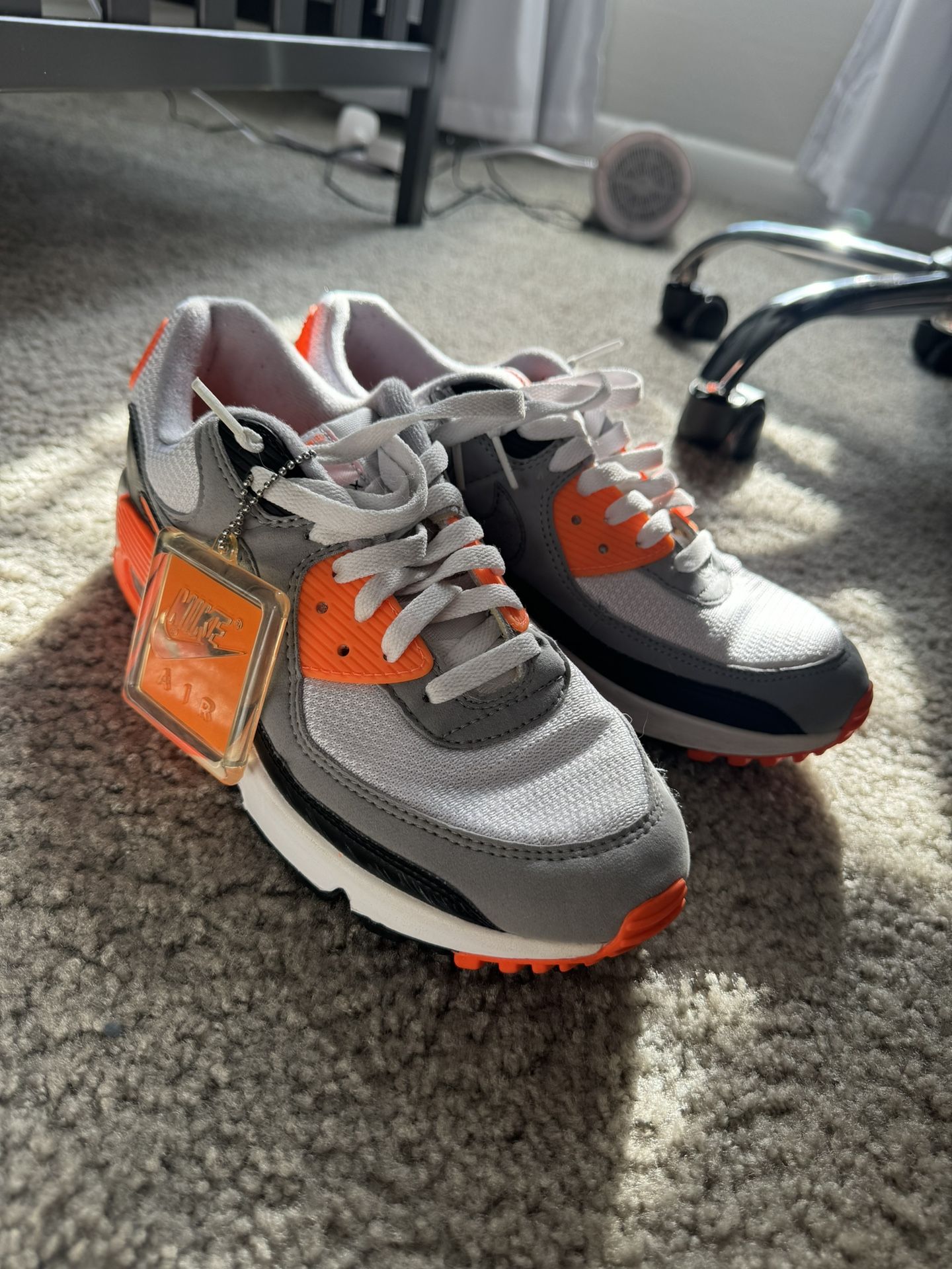 Size 9 in men. Paint scuffs on rear part of the left shoe still in good condition