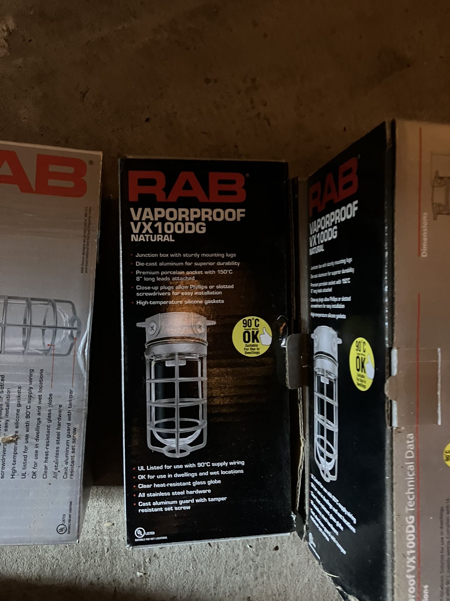 RAB VC100DG outdoor light glass domes 8 boxes of these , in brand new condition- does NOT come with a threaded base that it screws into just the glass domes that screw on top as well as the protective cage that goes around the glass.