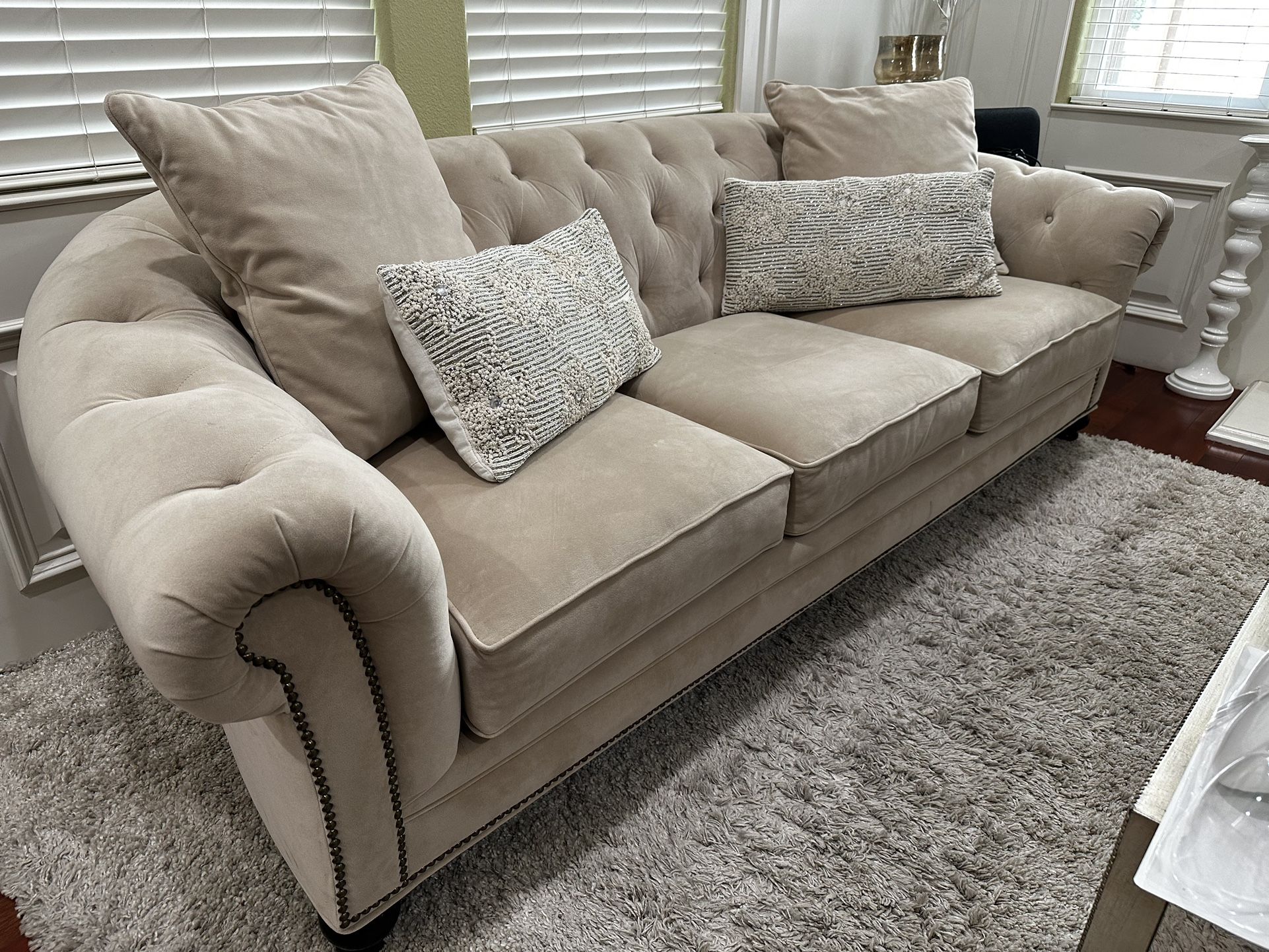 Less than 6 months old! Modern 3 Seater Couch Sofa Classic Tufted Back! Light beige velvet! Super comfy. Bought for $2200+ at Ethan Allen. Comes with 4 pillows! Moving away so selling everything! Check my other listings.