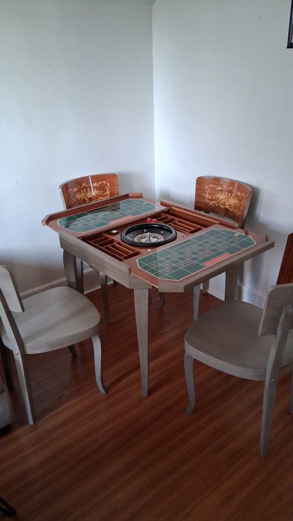 Is in good condition has scratches no cracks or bad damage. Has multiple games all with the pieces it needs (some pieces are damaged). Come with 4 original chairs and all the game bored and everything can be taken apart to fit in your vehicle. 1000 obo