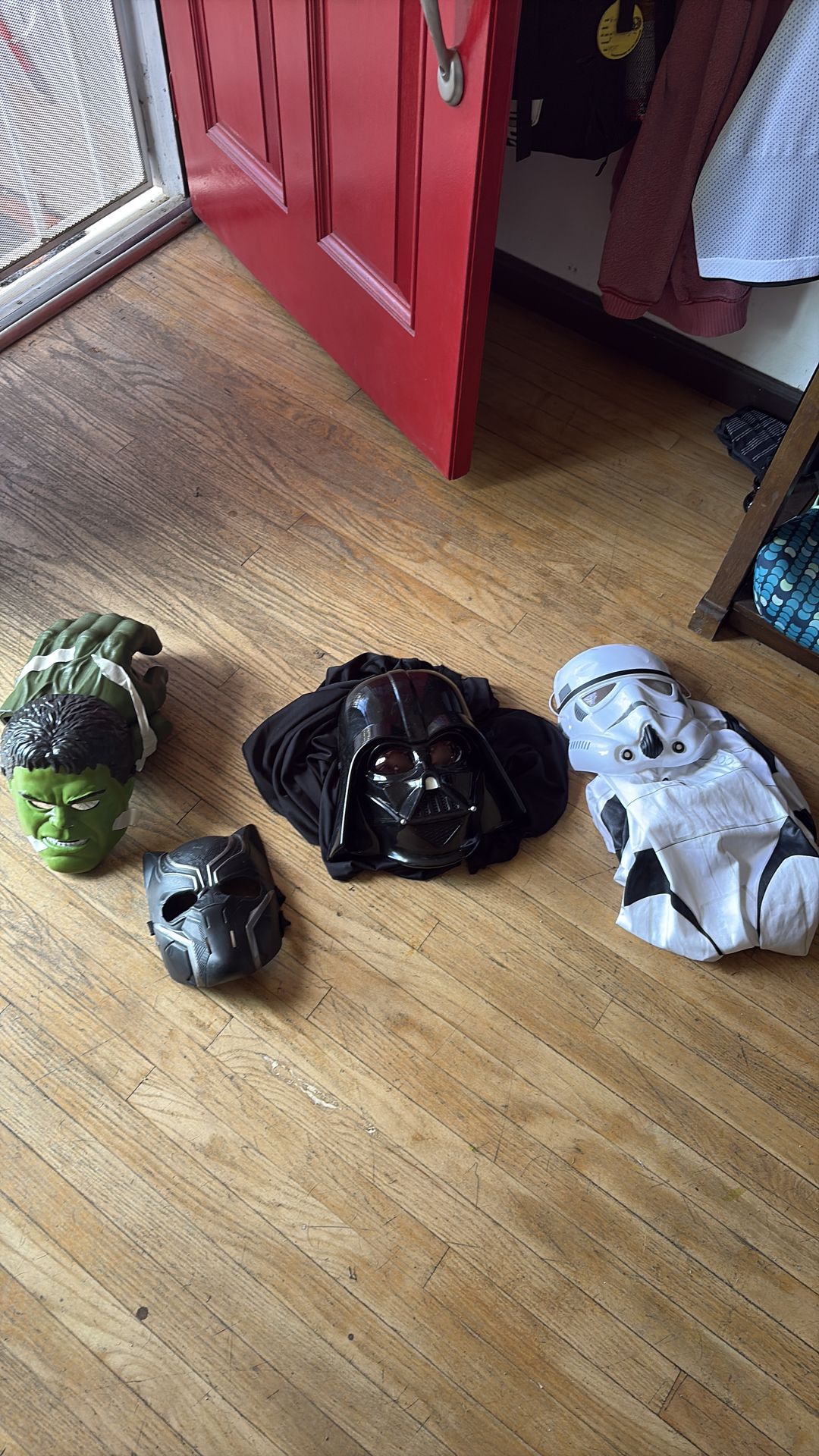Darth vader-cap and mask Stormtrooper-costume and mask Black panther-mask Hulk- mask and gloves Used