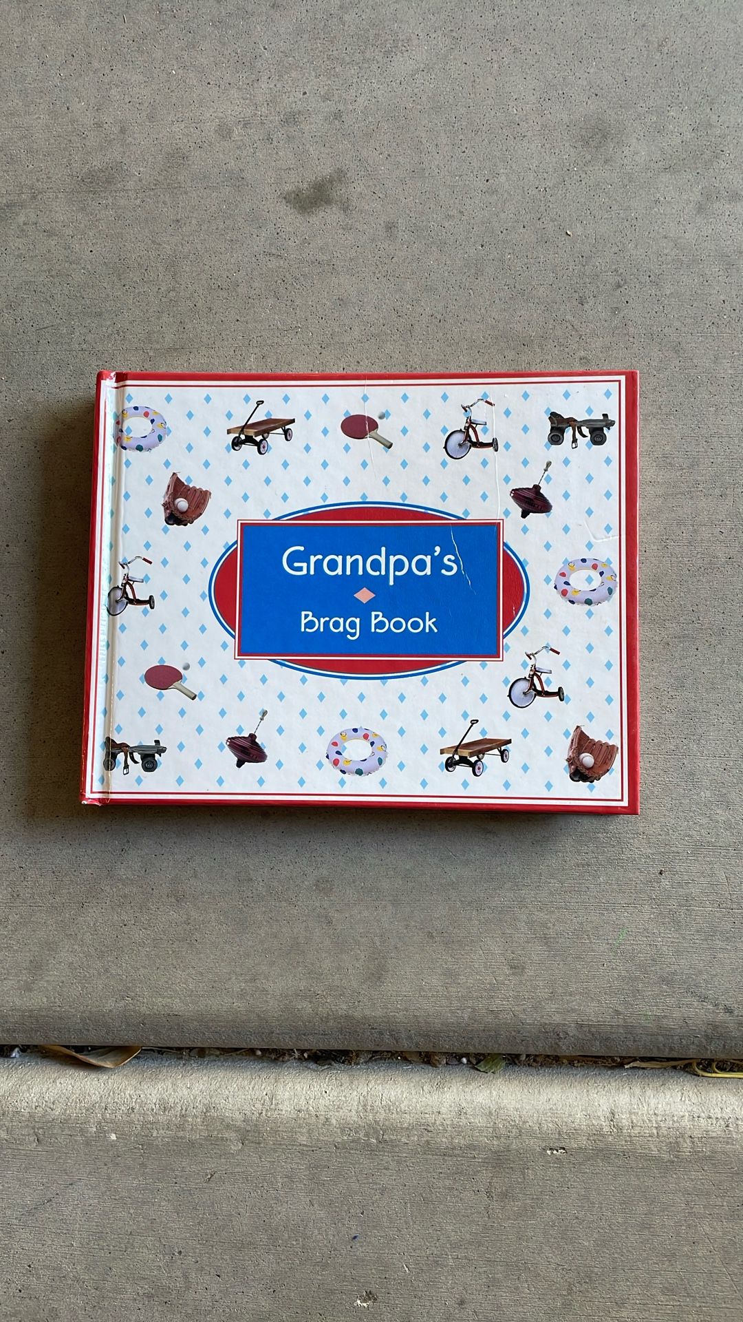 Photo Book . Cover says “zGrandpa’s Brag Book”. Inside the cardboard pages have various shaped frames for the grandchildren’s photos. Each has a place to write a label of who is on the photograph.