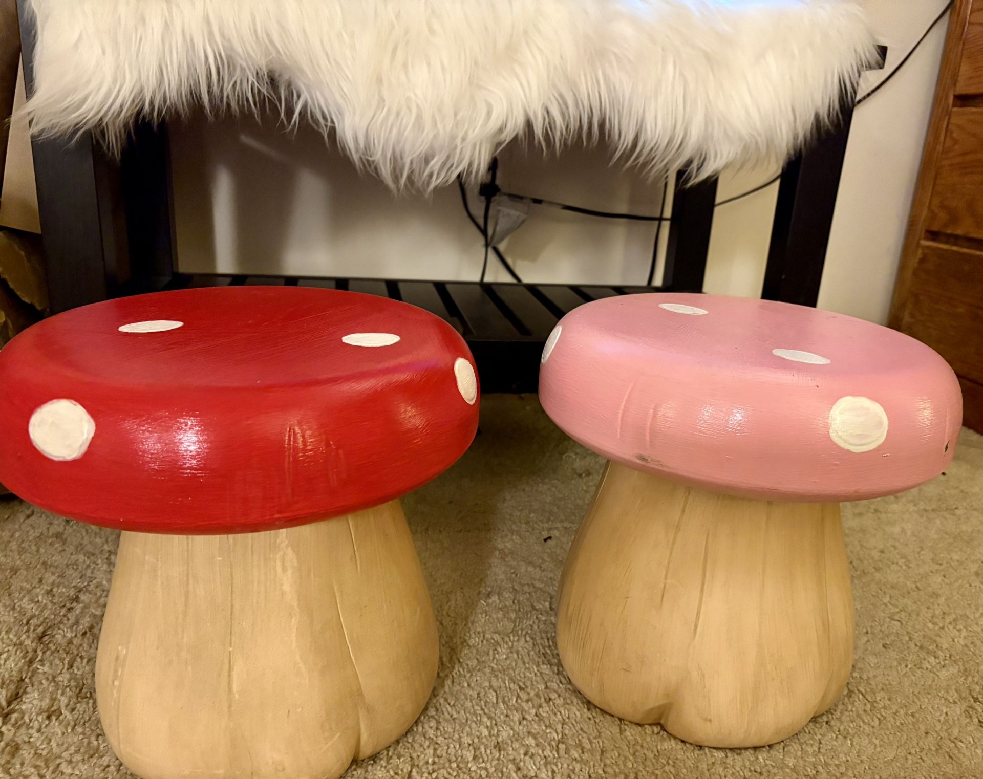 Large Mushroom Toadstools Great for children to use as a chair or for decor or to use as a small table for display They are used and show basic wear and tear from being scuffed However they are meant for outdoor use so that’s expected They can easily be repainted. They were actually a shade of green when I originally purchased them and I painted them myself. Heavy duty and durable, can support average adult weight sitting and standing They were originally $50 each due to being very well made and heavy duty, they weigh about 15 lbs each so they aren’t easy to knock over