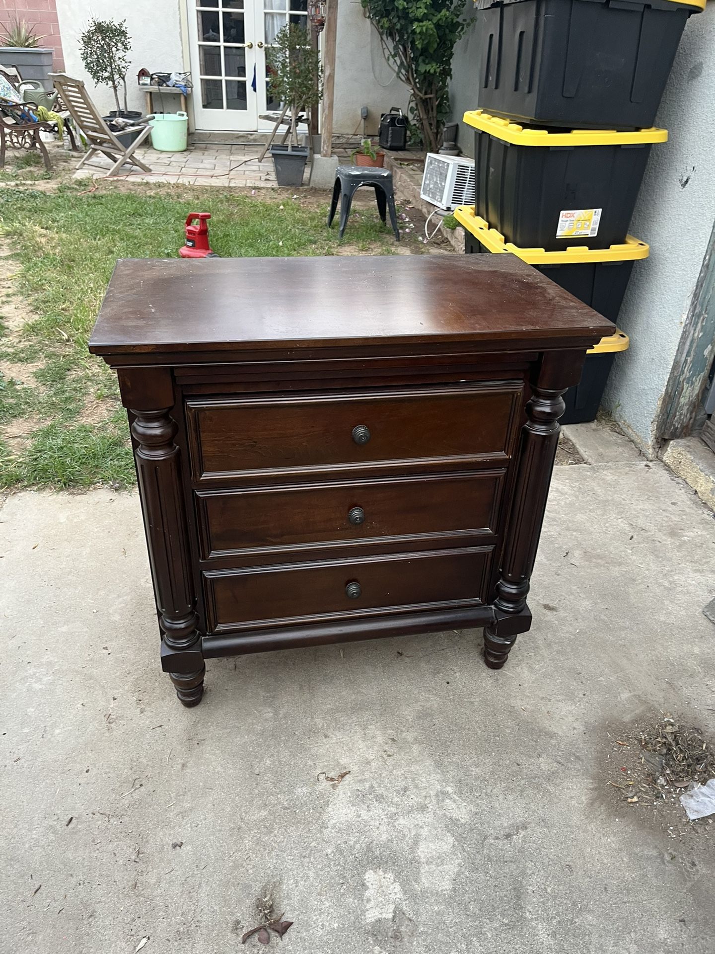 Wood dresser used and has some stains and scuffs but still sturdy and very good