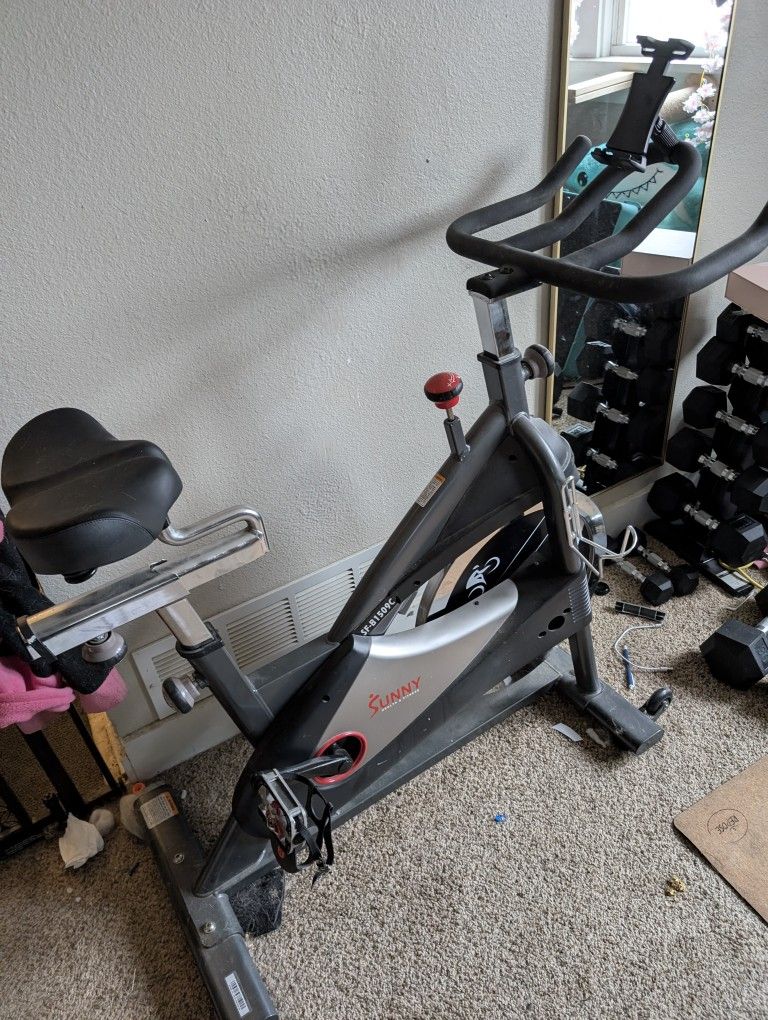 Used for 1.5 years, has a cushioned fully adjustable seat that didn't come with the bike, Selling because I no longer bike indoors. It's a little dusty, but works as good as new. Bluetooth cadence sensor was purchased separately. Only works with the SunnyFit app. I'll include the tablet holder too - I used my iPad with the SunnyFit app for tracking.