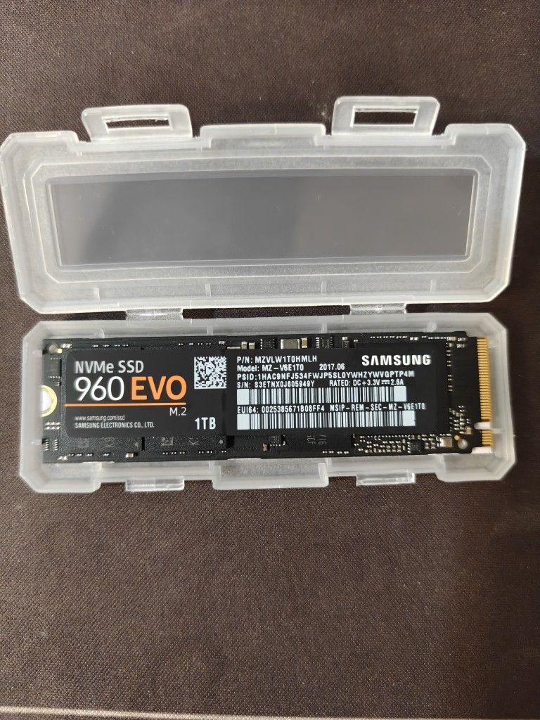 Located in West Covina Selling for $80 FIRM Cash/Zelle/Cashapp/Venmo accepted Trades considered Used 1TB Samsung 960 Evo NVMe SSD. Fully wiped and ready for new owner Comes with protective case Message me for any questions or information.