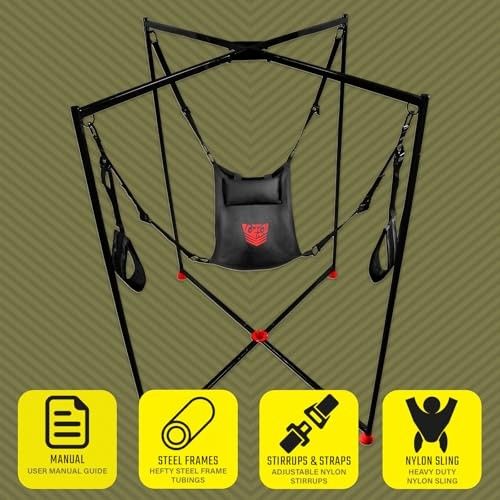Fort Troff Rock Steady S## Sling Description Brand: Fort Troff Color: Black Features: COMPACT AND PORTABLE: Rock Steady is the first sling that delivers a clank-free ride. It’s equipped with infinitely adjustable nylon straps + stirrups. CLANK FREE RIDING: Enjoy a smooth, quiet ride with Rock Steady’s innovative design that eliminates distracting noise EXCEPTIONAL STABILITY: exceptionally stable ride… no distracting sway. Rock Steady is precision-crafted with hefty square tubing and grippy rubber feet EASY TO ASSEMBLE: frame assembles quick n’ez and can be done solo. A simple assembly tool is included for the stabilizing screws DURABLE & WASHABLE: Constructed from premium-quality ballistic nylon and featuring a removable cush pillow, Rock Steady is both durable and easy to clean