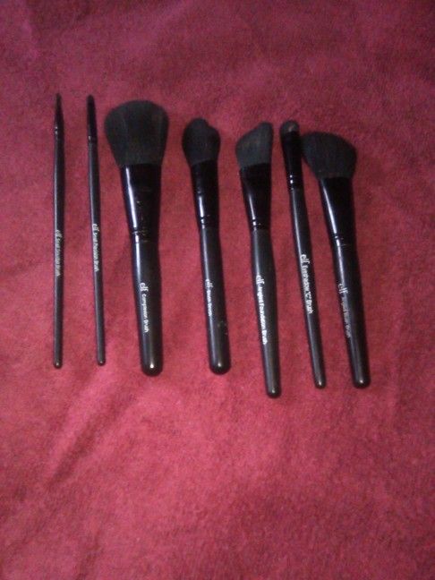 7piece set by Elf there is angled blush and foundation regular blush complexion eye-shadow C small precision and small smudge brush must buy as a set all are new or like new