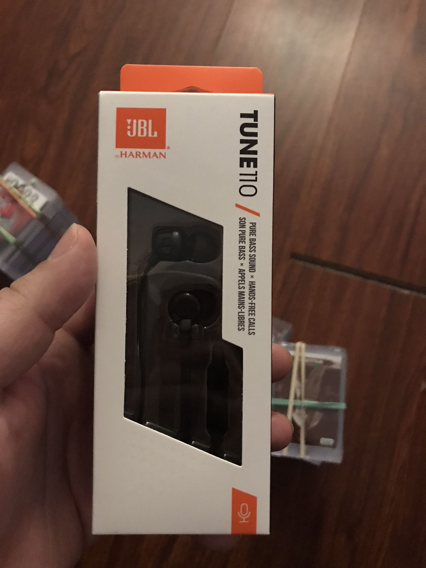 Brand new JBL headphones hands free calls tangle free flat cable pure bass sound . Black comes with the charging cord also 3 different sizes of buds