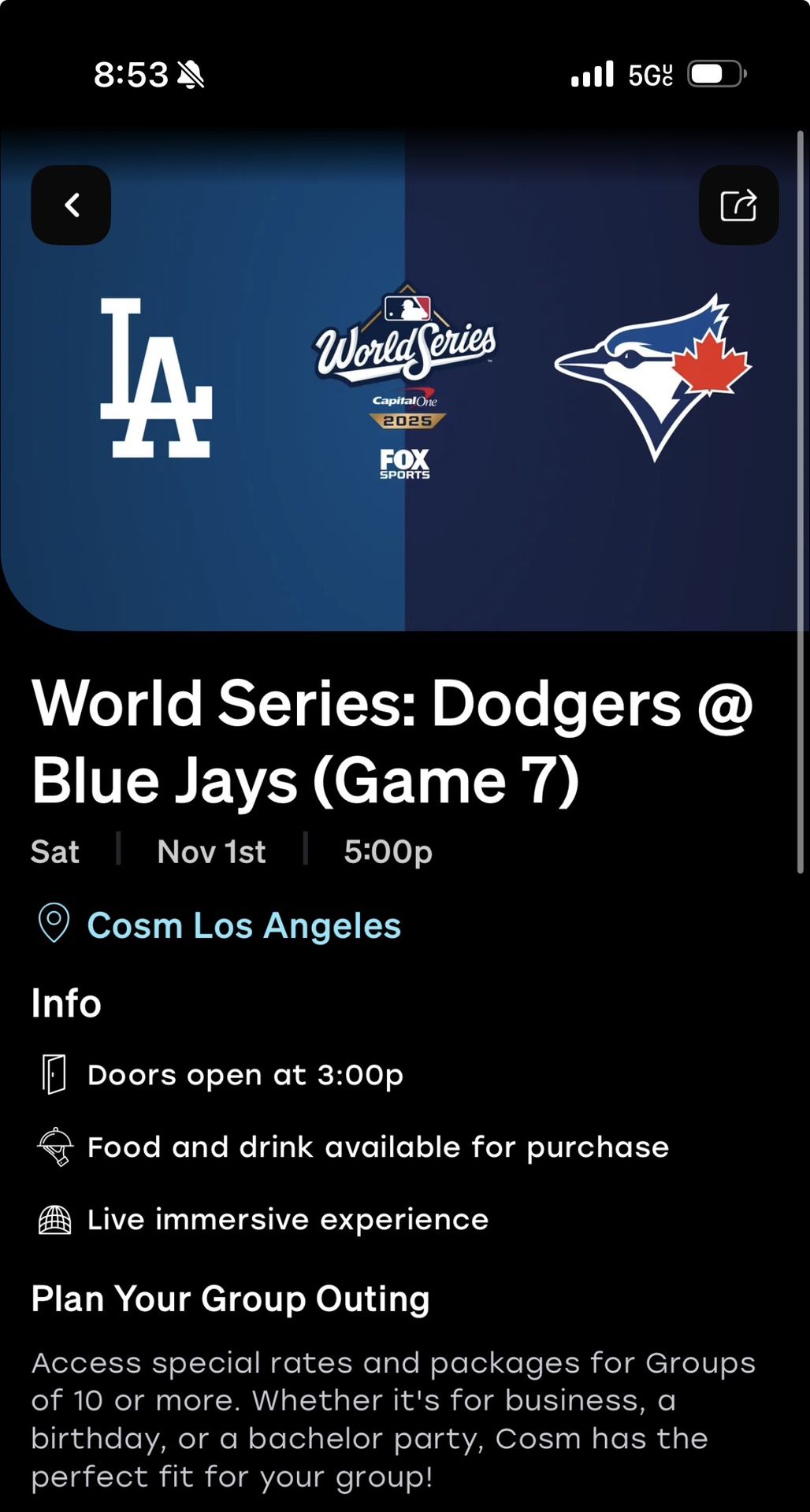 Dodgers Game 7 Cosm Dome Area Reserved Seating
