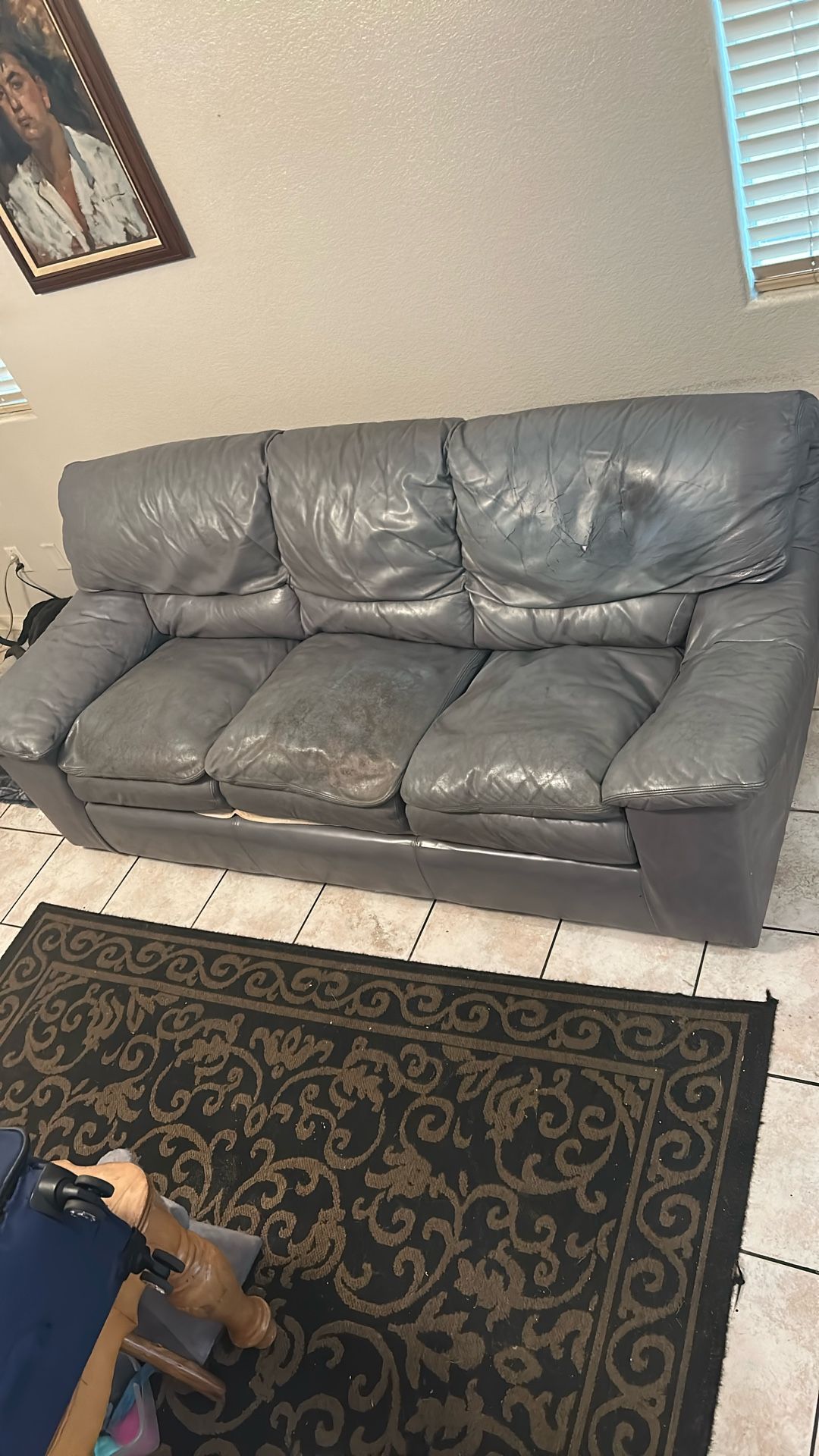 This is a gray leather couch that does have some wear on it but is still in great shape