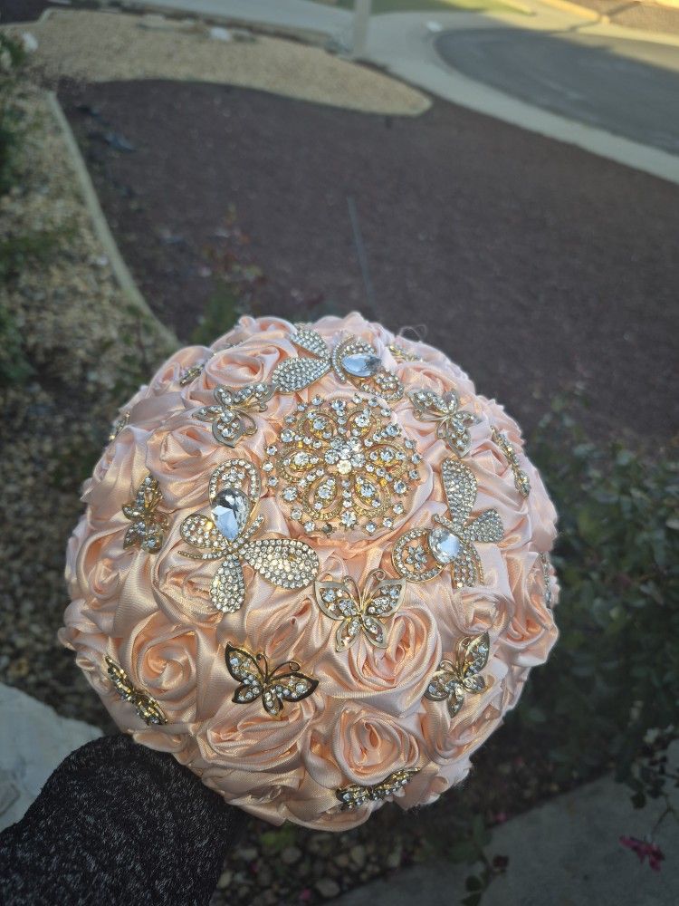 Beautiful silky handmade rose bouquet with gold rhinestone accents. Can be used for a quince or wedding or even as decoration. Retails $130-$200 with tax