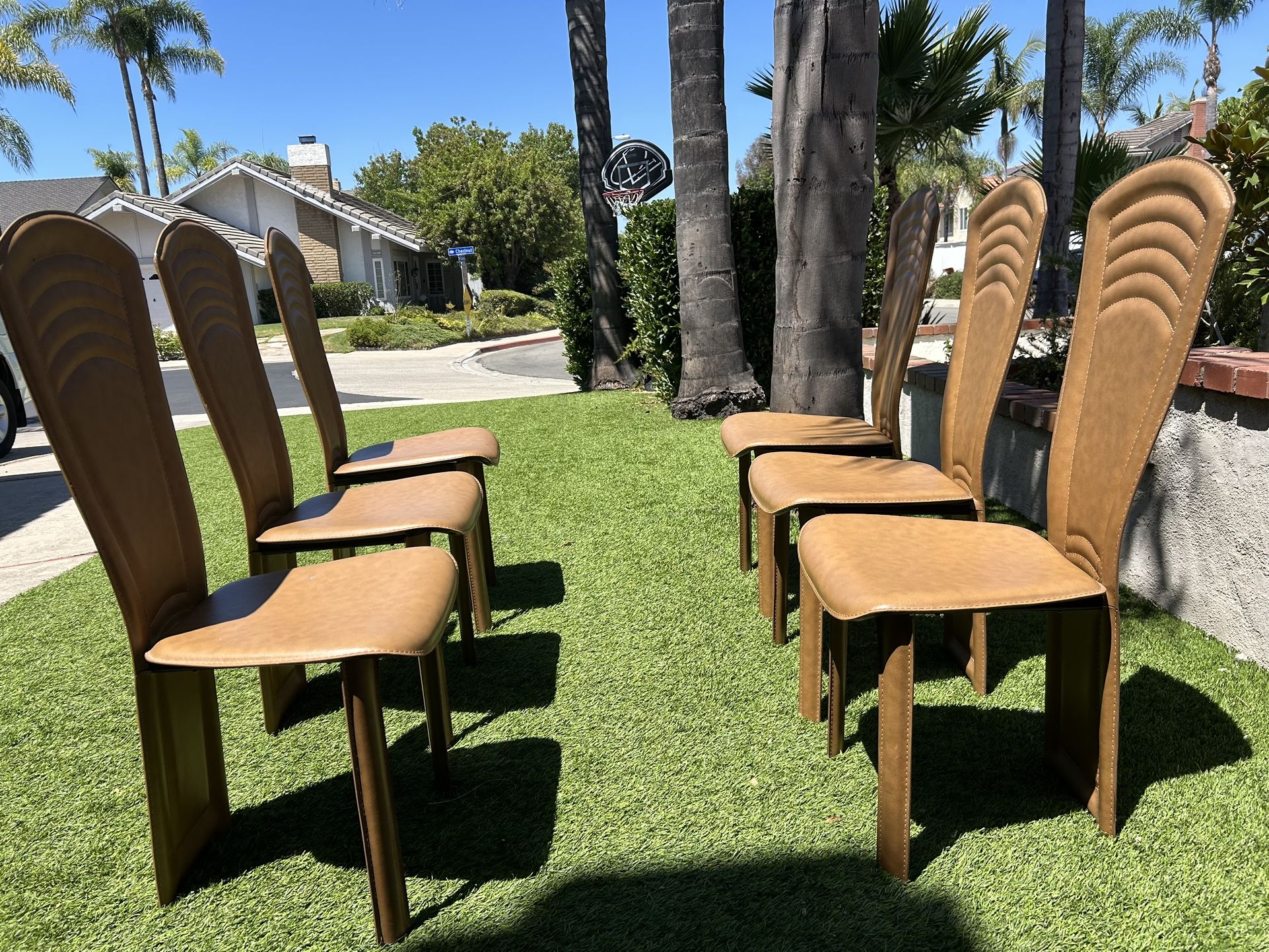 6 leather chairs Leaf shape back support Great condition Seat height 19” Asking $250