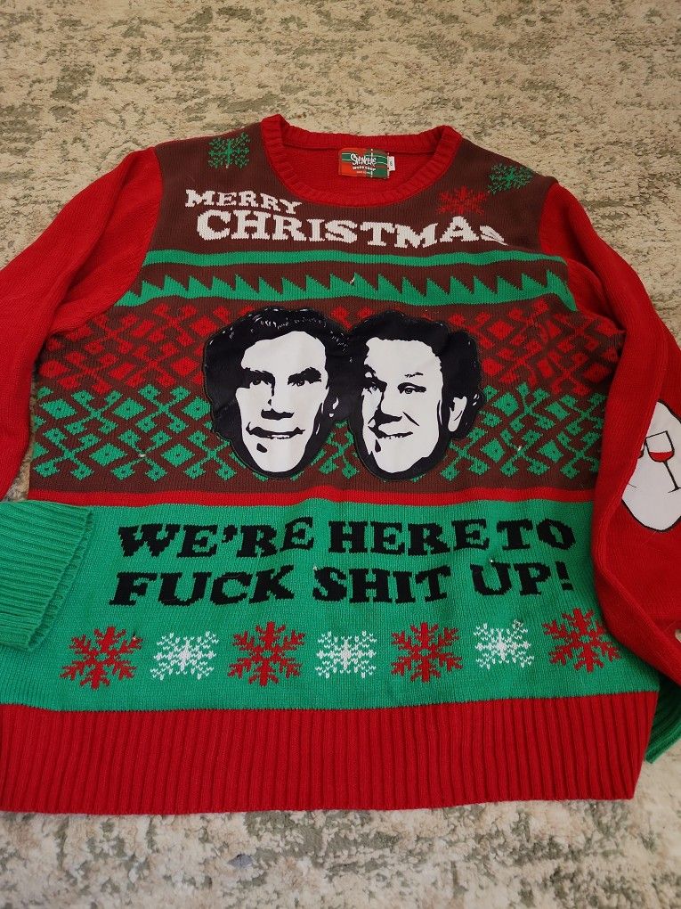 Step Brother's movie light up ugly christmas sweater "We're here to eff sh** up!" Size XXL. Has small remote on the inside toward the bottom in a tiny black pocket. Changeable light settings. Wine glass elbow patches. Worn one time for a very short amount of time. It's pretty warm. Got hot quick. Still brand new no snags tears or rips.