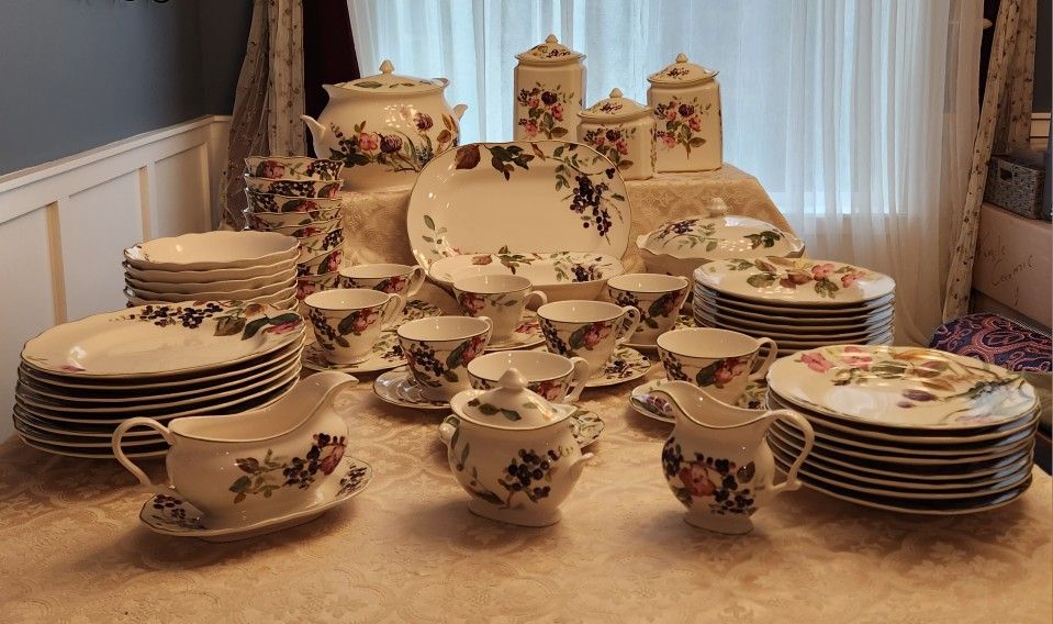 These dishes are beautiful. It's a set for 8 people. Dinner plates, salad plates, rimmed salad bowls, cereal/fruit bowls, pasta bowls, cups w/saucers as well as a canister set set, gravy bowl w/under-plate, sugar and creamer set, Oval serving plater, round covered vegi dish, and a Soup Tureen w/no ladle. They are in excellent condition with the exception of a small chip in one of the ceral/fruit bowls and a pasta bowl. Even though the pattern has been discontinued, you can still buy replacements on e-Bay. We have kept them in a hutch/buffet oak wood cabinet, which is also for sale separately. We could make a deal if sold together.