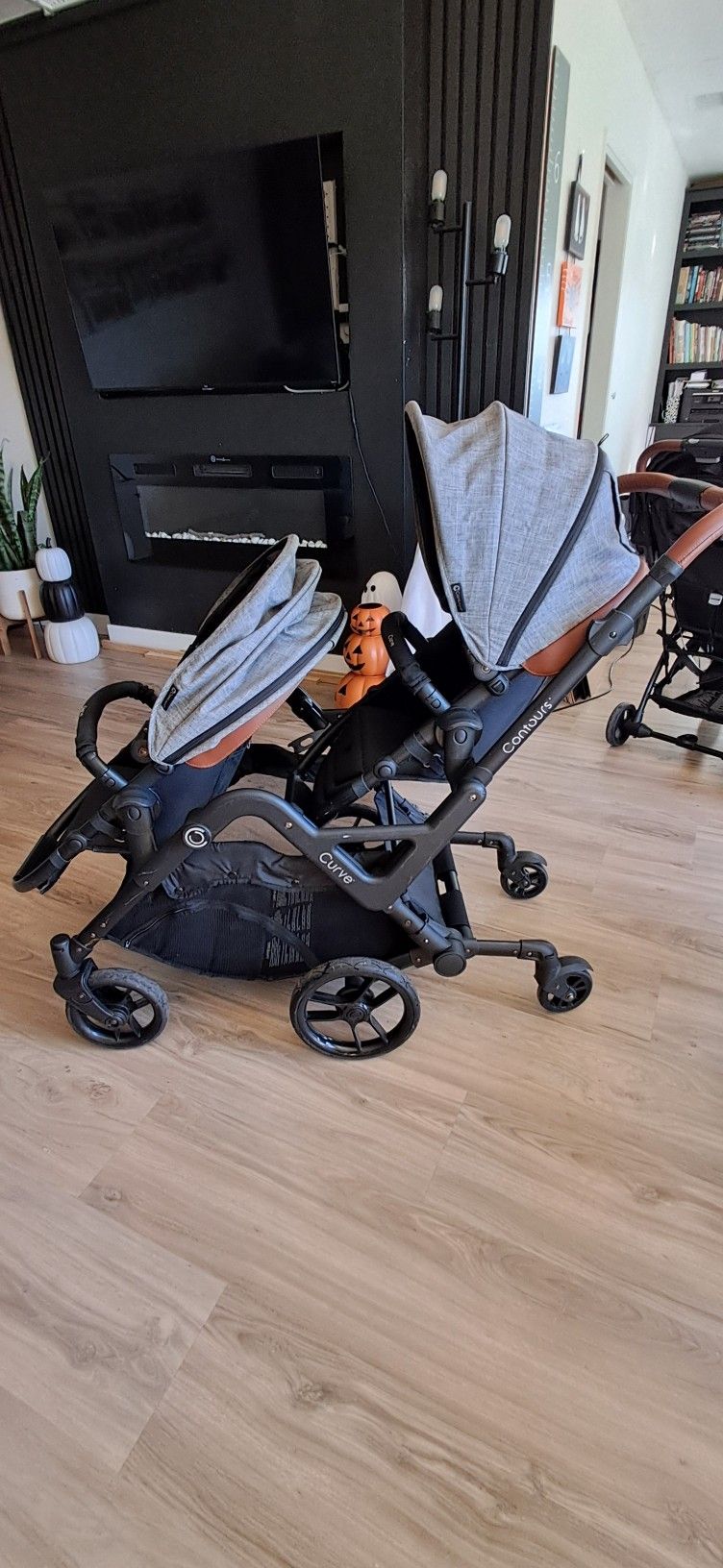 This stroller is so versatile. This stroller is a powerhouse it is not light by any means but It's the easier double stroller to push due to the extra double wheels. You can literally spin it around with 2 fingers. Both seats recline and sit both forward and backwards. The stroller also folds with both seat attached. I'm also including a carseat attachment that clips into the seat attachment and can fold up with the stroller.