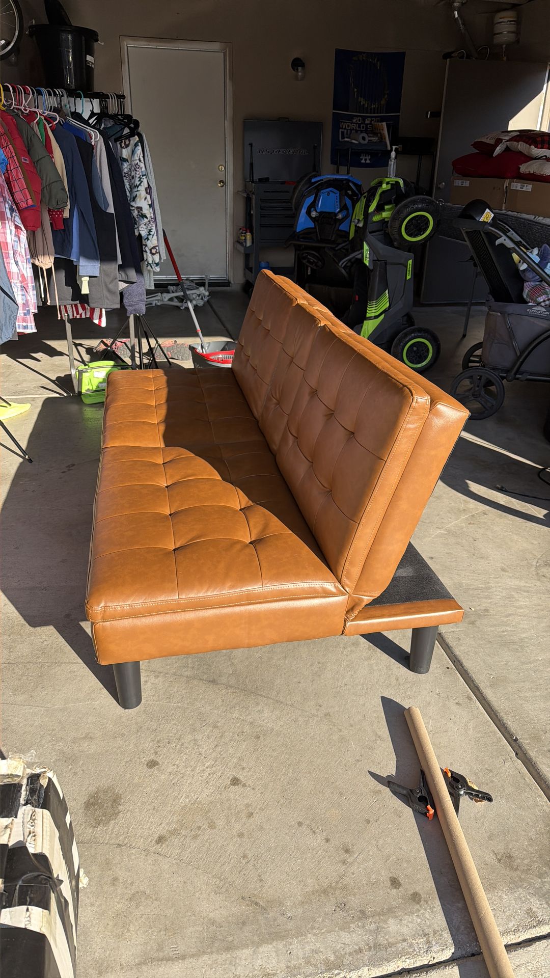 Leather futon in perfect condition no rips, stains or crease. It was used as a decorative piece. It’s about a year or less old. Turns into a bed.