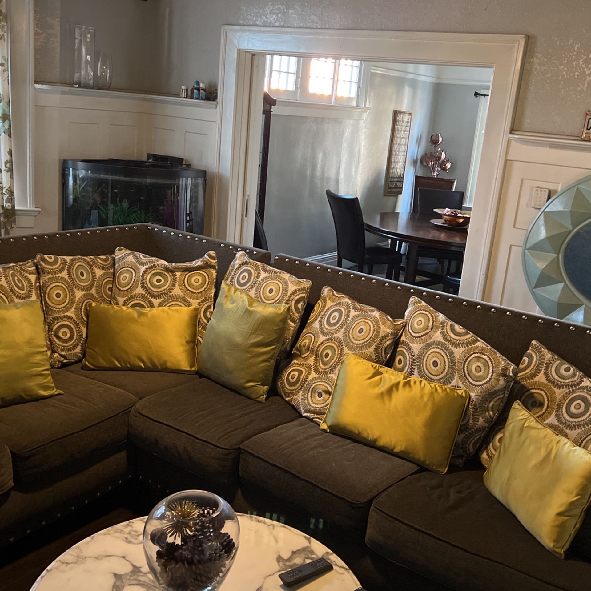 Green and gray sofa, sectional good condition seats five comfortably. Also two people can sleep on it less than four years old great condition front and back and cushions.
