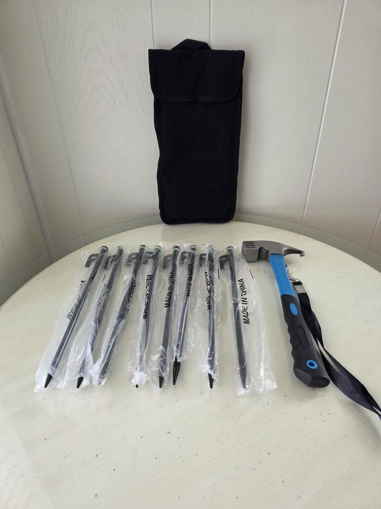 Brand new, never used. Carbon steel hammer, rust-resistant, fiberglass non-slip shock handle, 8 ledger floor spikes (11 3/4") with silicone glow rings, carry case