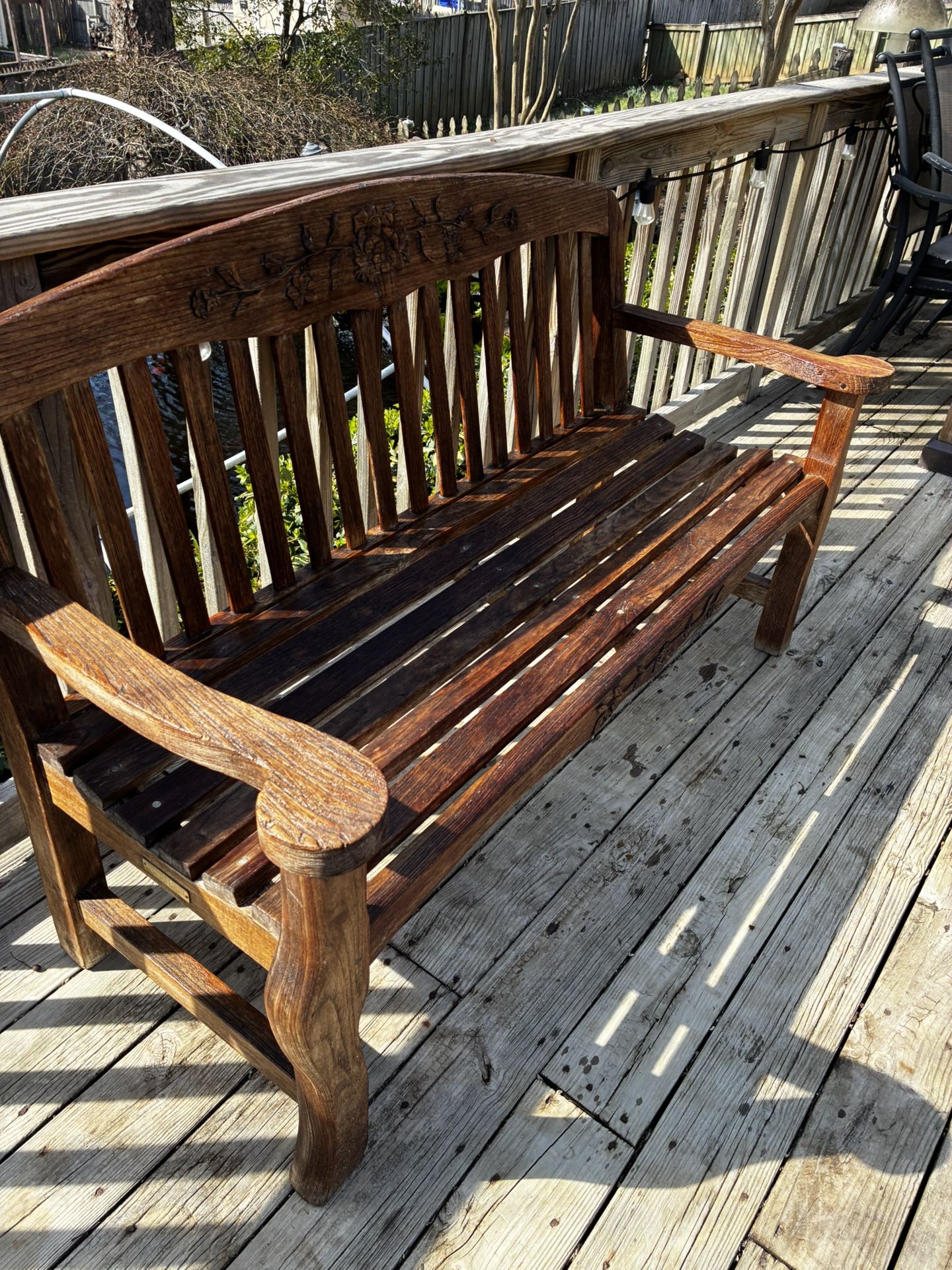 High End Kingsley Bates Park Place Solid Teak Bench. Has great wood craving Detailed. Just been cleaned and oiled for up coming Summer. Teak will last a life time if you keep it oiled. Beautiful details on this bench. 55”L 23” D 35” H seat height is standard 17” $475CASH ONLY. BOWIE MD.