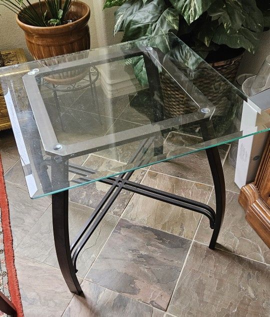 End table is 22" tall and the glass top measures 24 in by 24 in. It has a black metal frame. The table is sturdy and in excellent condition with no scratches or scrapes.