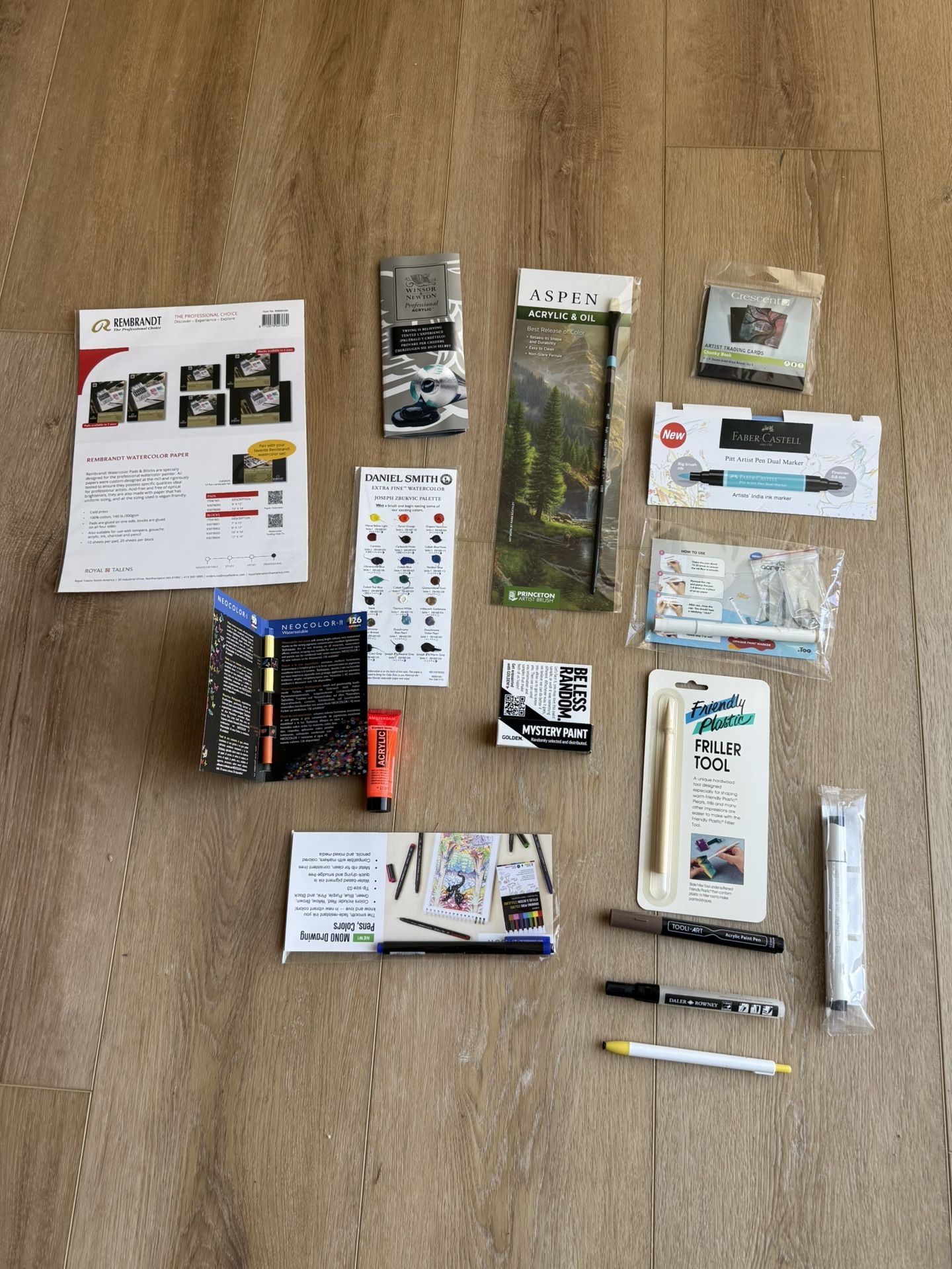 Art Lot - Filled With Fun Surprises A great mix of supplies for you or the art lover in your life. All new product! Package comes with the following: •Aspen Acrylic & Oil Brush (Princeton Artist Brush) •Crescent Artist Trading Cards •Daniel Smith Water Color Samples •Faber-Castell Pitt Artist Pen Dual Marker - Artists’ India Ink Marker •Opaque Paint Marker by Copic Acrea •Winsor & Newton Acrylic Paint •Neocolor Watersoluble sample (Carandache product of Switzerland) •Amsterdam Acrylic Paint •Golden Mystery Paint •Amaco Friendly Plastic Friller Tool •Mono Drawing Pen •FW Mixed Media Paint Marker •Clickart Zebra Pen •Tooli-Art Acrylic Paint Pen •Rembrandt Watercolor Paper $25 for all Artsy, Gift, Gifts,