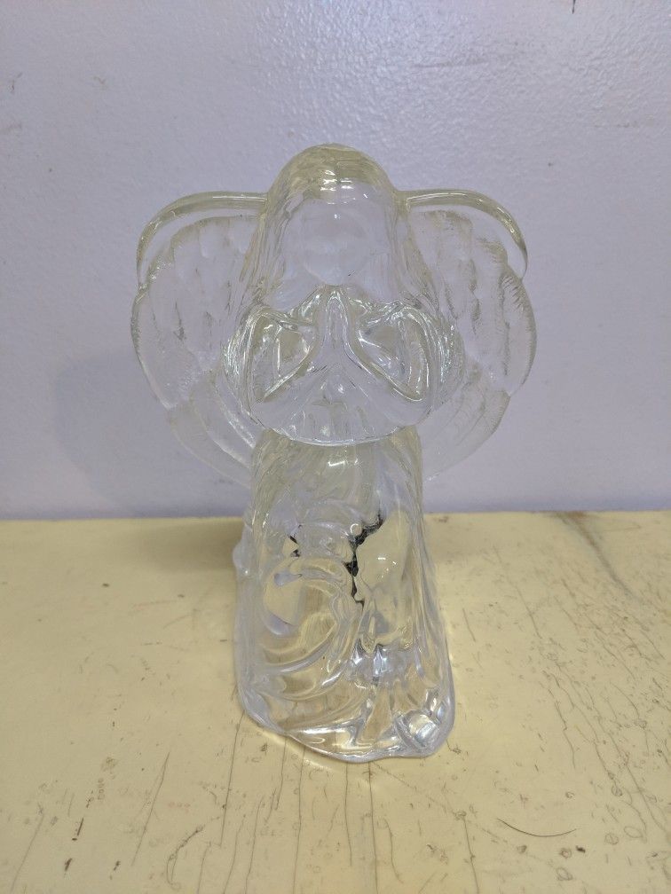 This is a beautiful praying Angel made of 24% lead crystal and holds a votive tea light candle. Weighs approx 2lbs 4oz , stands 5 3)4" tall X 4.5" wide X 5 1/2" deep. Excellent condition, no chips or cracks .
