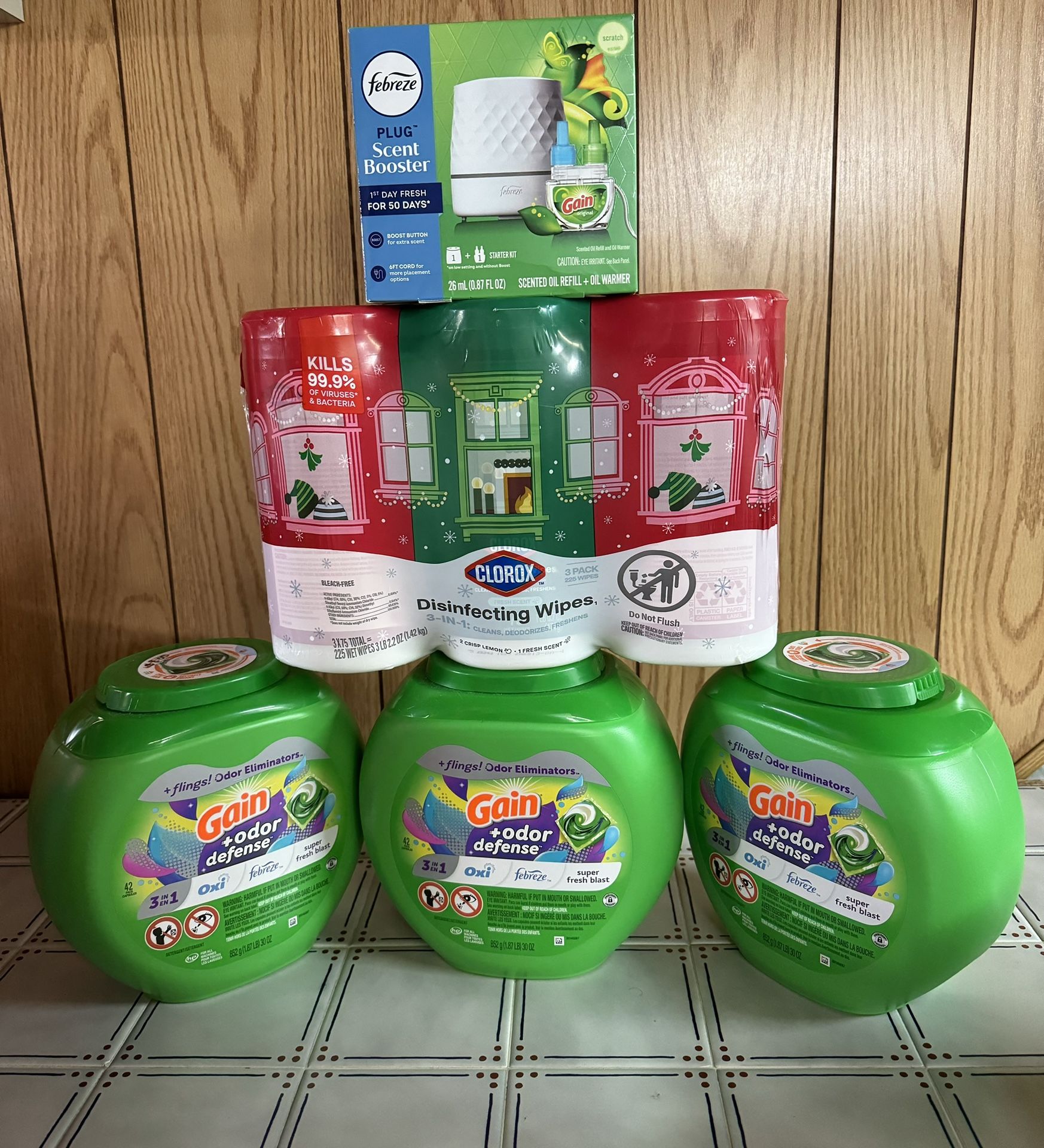 Gain detergent, Clorax wipes, Febreze air